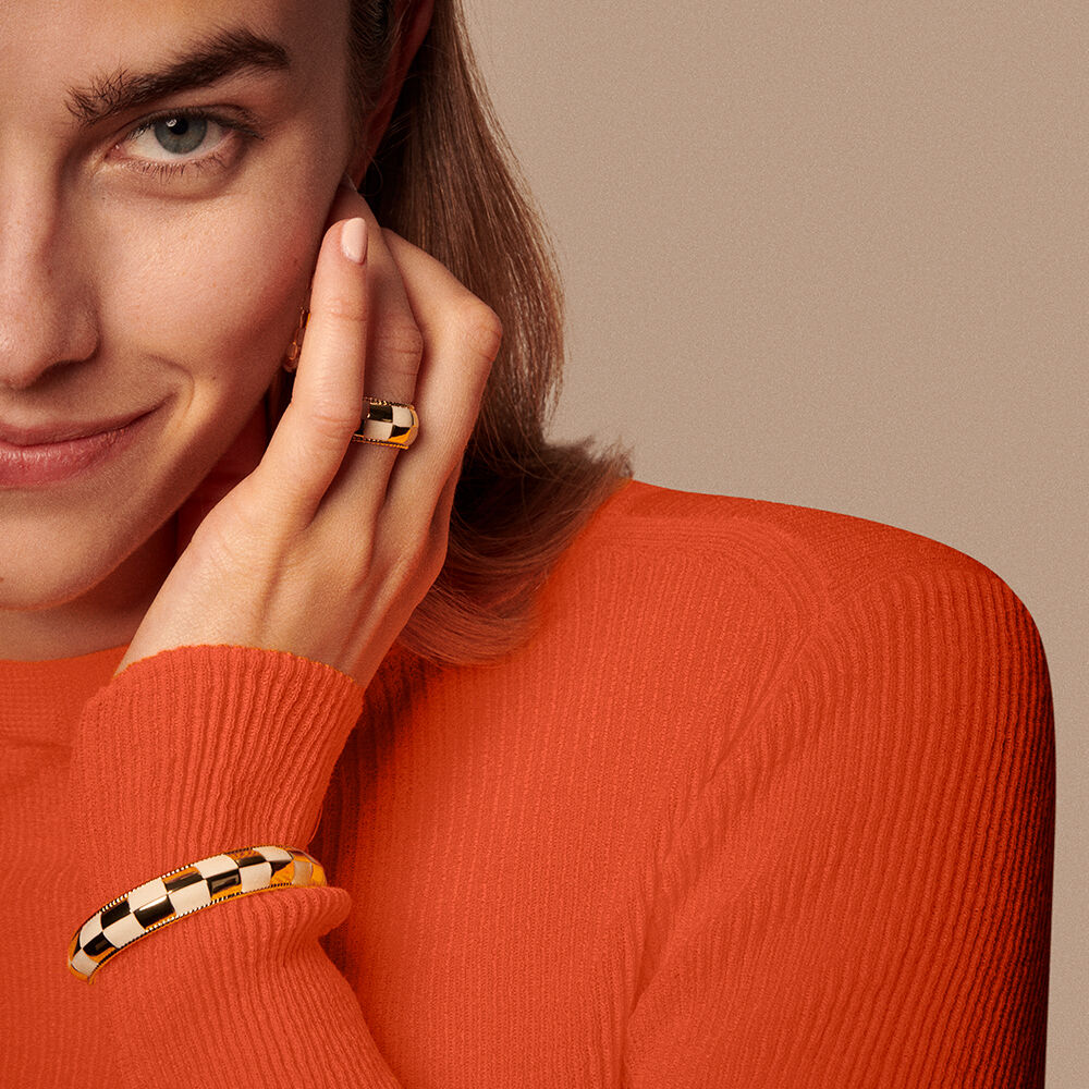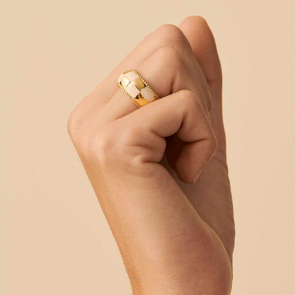Anillo acabado en oro con estampado damero en esmalte de color crema. Si eres fan de los anillos, éste es un punto más y no puede faltar en tu joyero, aportará el twist definitivo a todos tus looks. La inspiración sixties viene pisando fuerte y no puedes quedarte atrás.