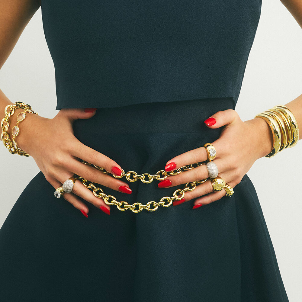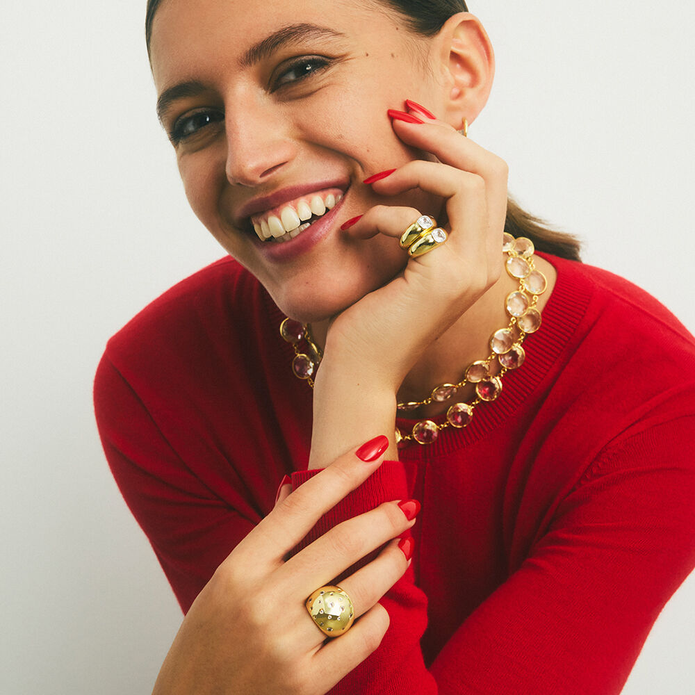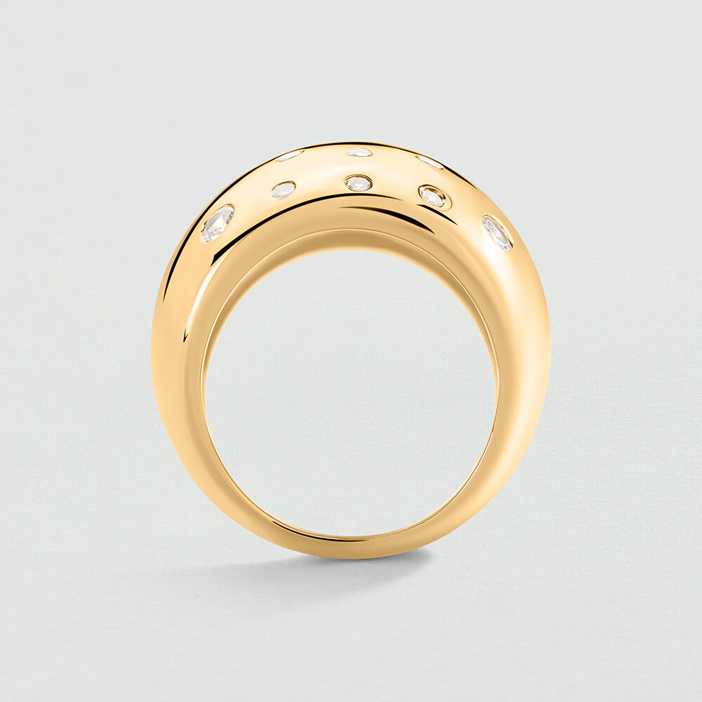 Anillo ancho acabado en oro con circonitas incrustadas. Un twist irresistible para aportar todavía más luz a tus días.