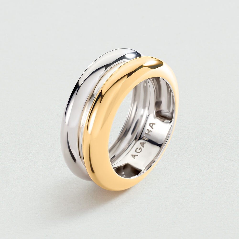 Anillo doble bicolor de plata de ley con baño de oro. Un diseño de alta joyería que podrás lucir con el resto de tus joyas favoritas, va con todo.