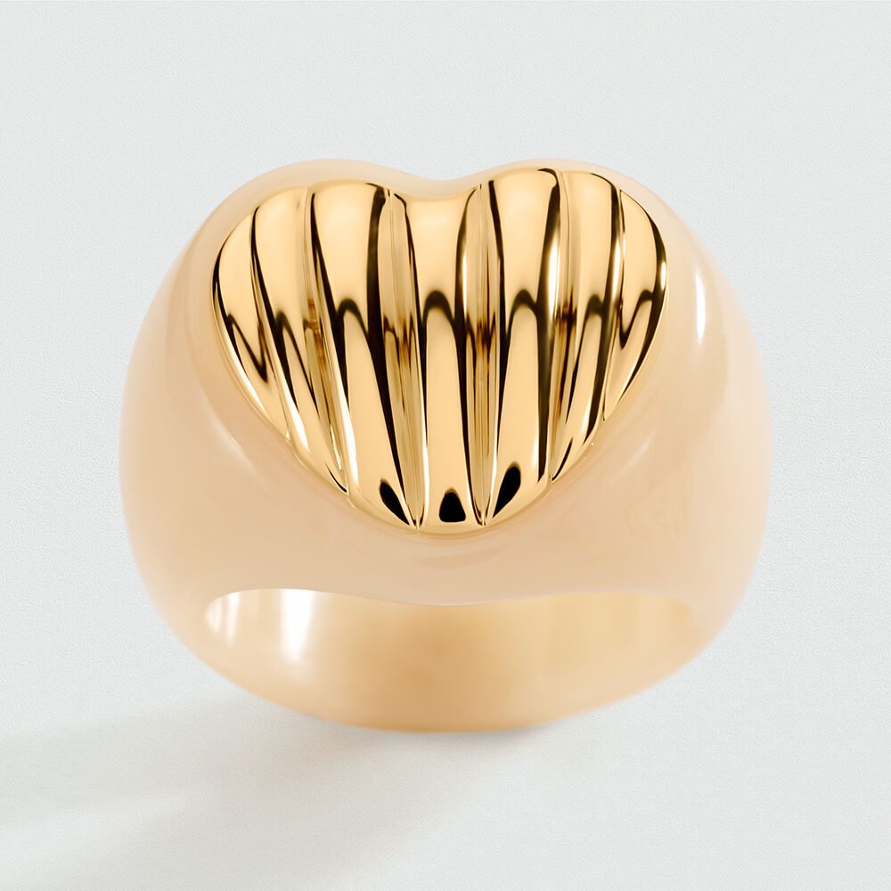Anillo ancho de resina con corazón texturizado grande acabado en oro. Existe en rojo y en blanco roto. Son nuestros favoritos de esta colección y van a volar. ¡No te quedes sin ellos!
