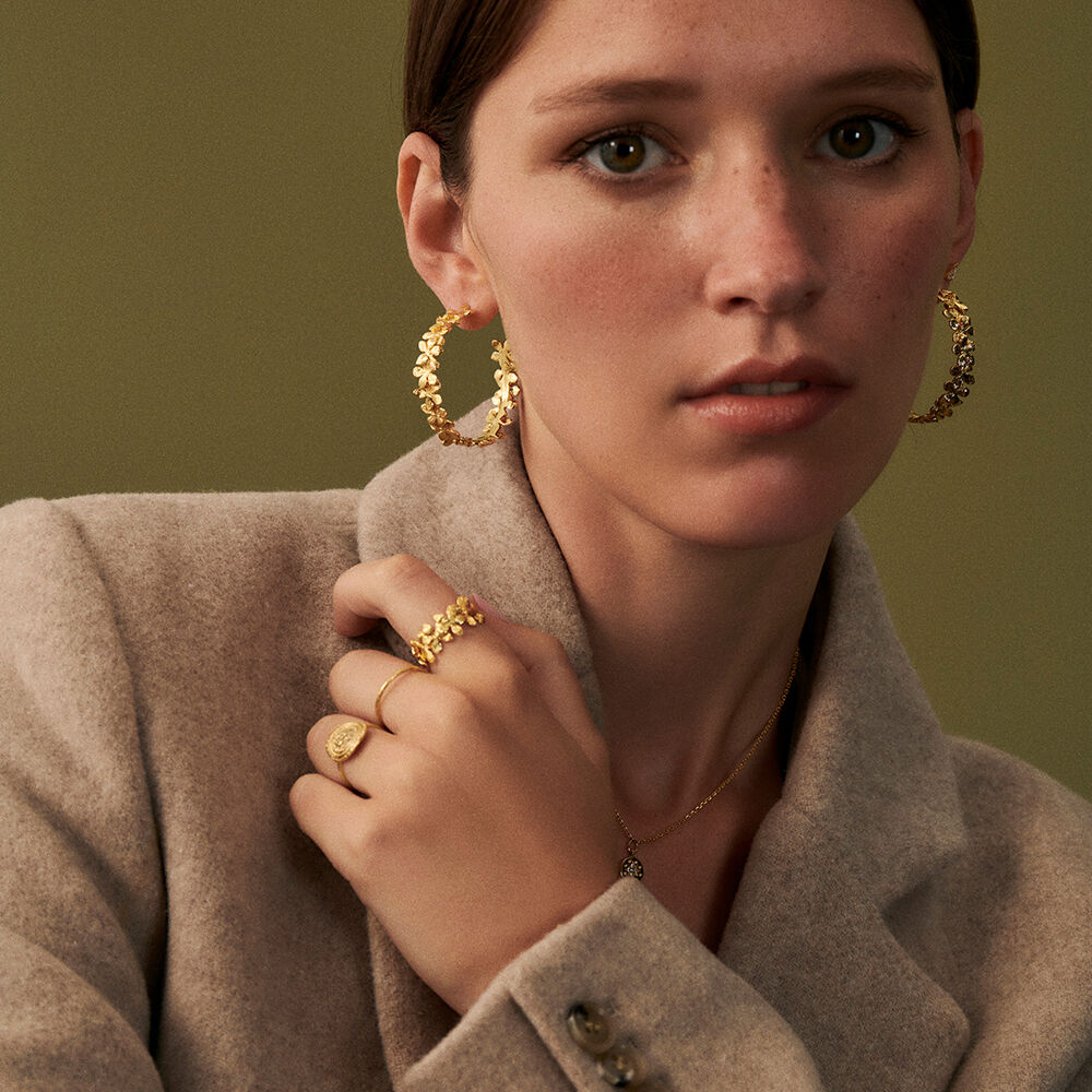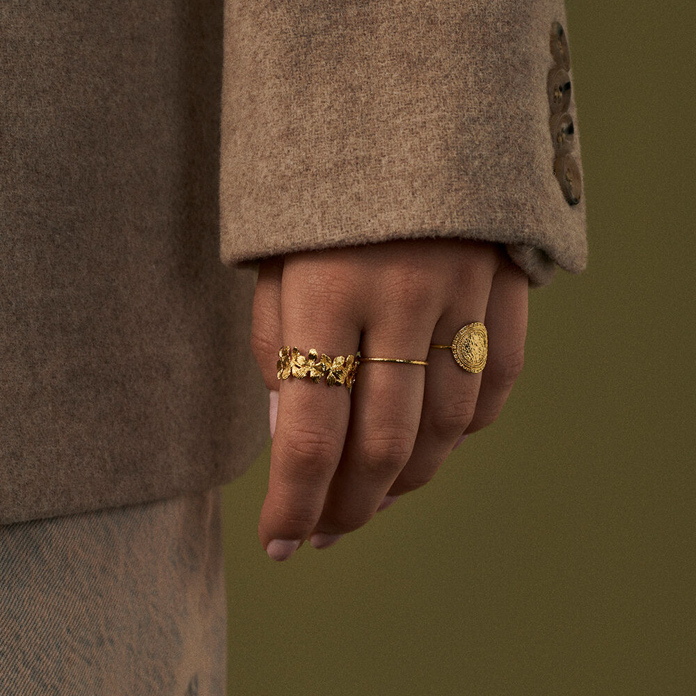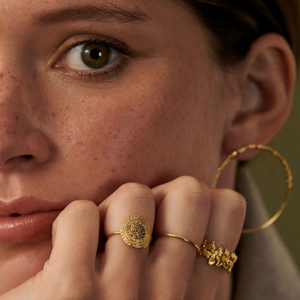 Anillo fino acabado en oro con medalla grande texturizada. Una propuesta diferente que atrapará todas las miradas..