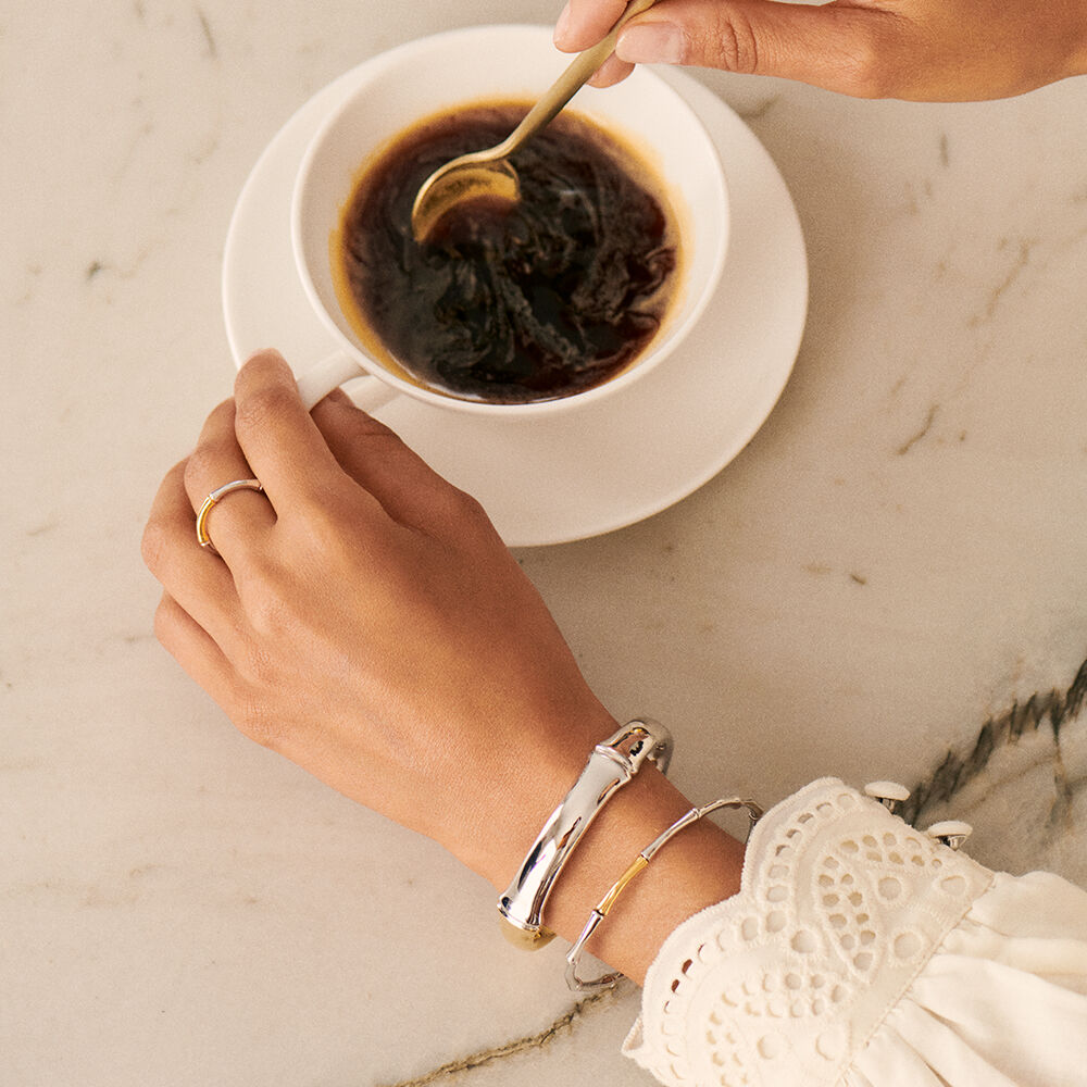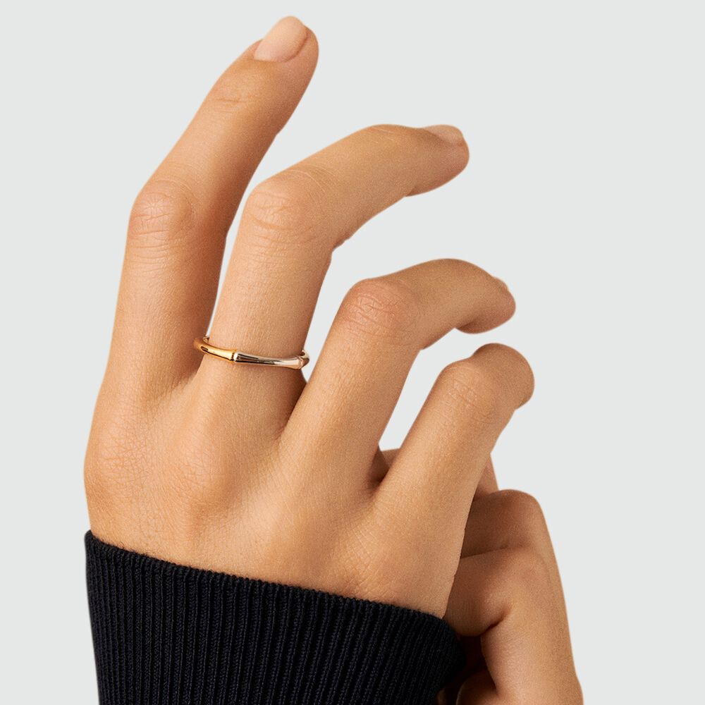Anillo fino bicolor acabado en plateado y dorado. Inspirado en los tubos de bambú, es una joya muy original y fácil de llevar, ¡No te quedes sin él!.