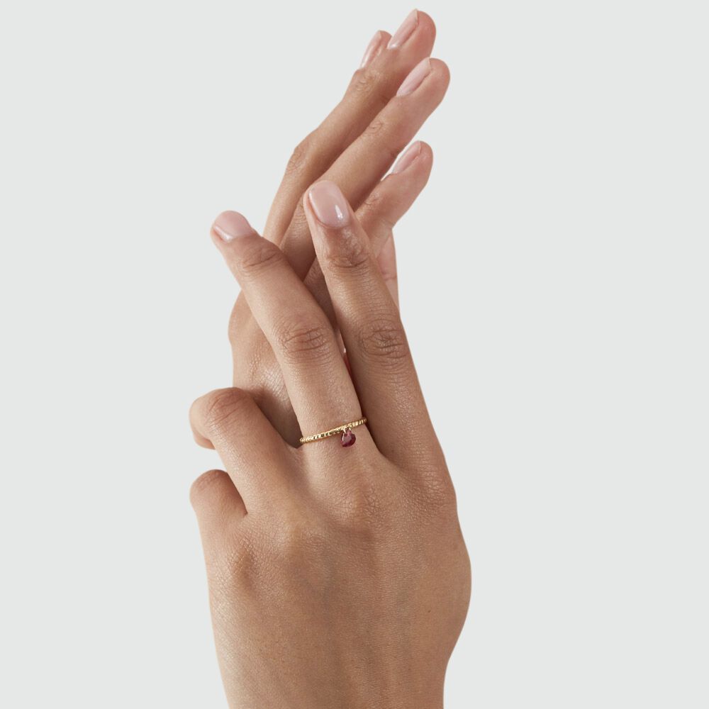 Anillo fino de plata de ley con baño de 3 micras de oro de 18k y corazón de circonita rojo colgando. Heart lovers, esta es vuestra colección, una oda al amor que podréis llevar a diario y que aportará luz y color a vuestras jornadas.