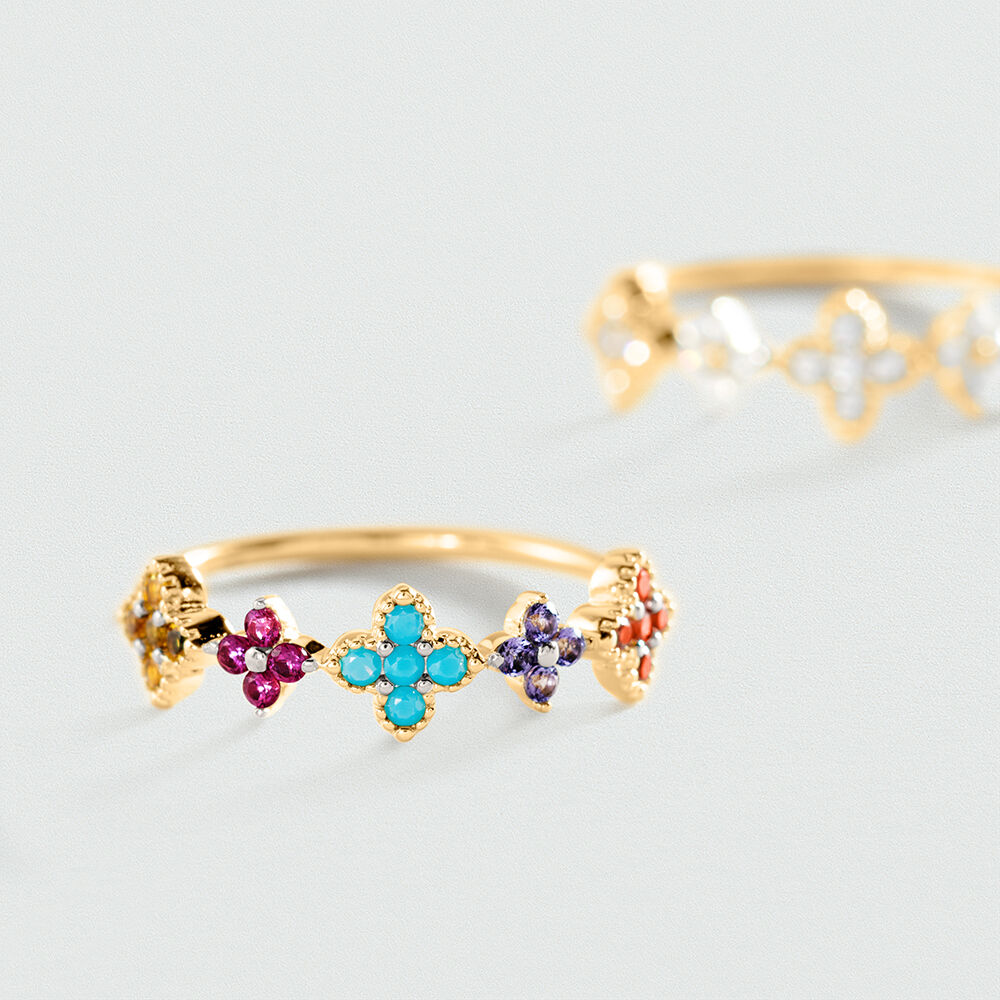 Anillo de plata de ley y baño de oro con florecitas de circonitas en color cristal o multicolor. Una opción súper primaveral que querrás lucir a todas horas. Una joya elegre, favorecedora y fácil de combinar que no te querrás quitar.