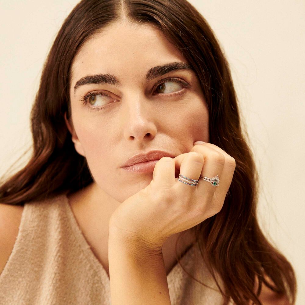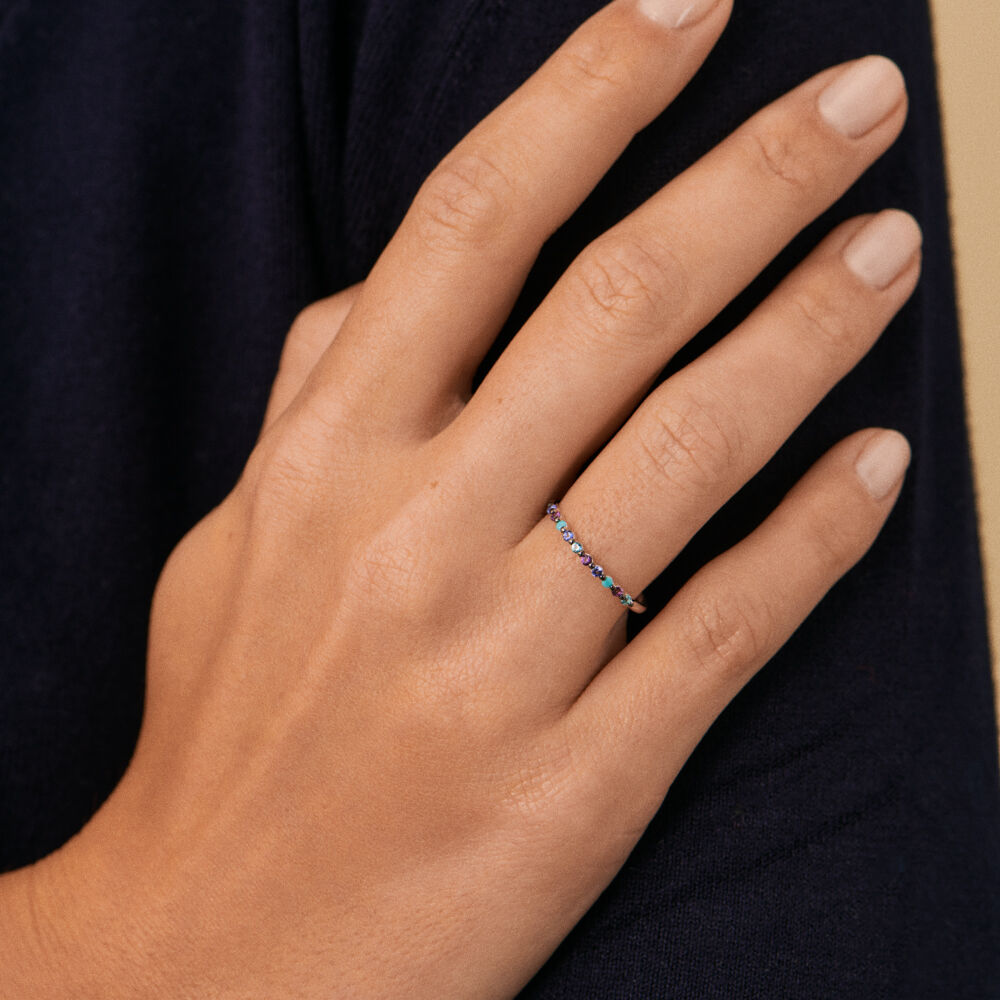 Anillo fino de plata de ley y circonitas, tú decides si en color cristal para una opción más neutra o en multicolor para un twist definitivo. Una opción ideal para combinar con los que ya tienes y dar el toque de brillo definitivo a tu mano..