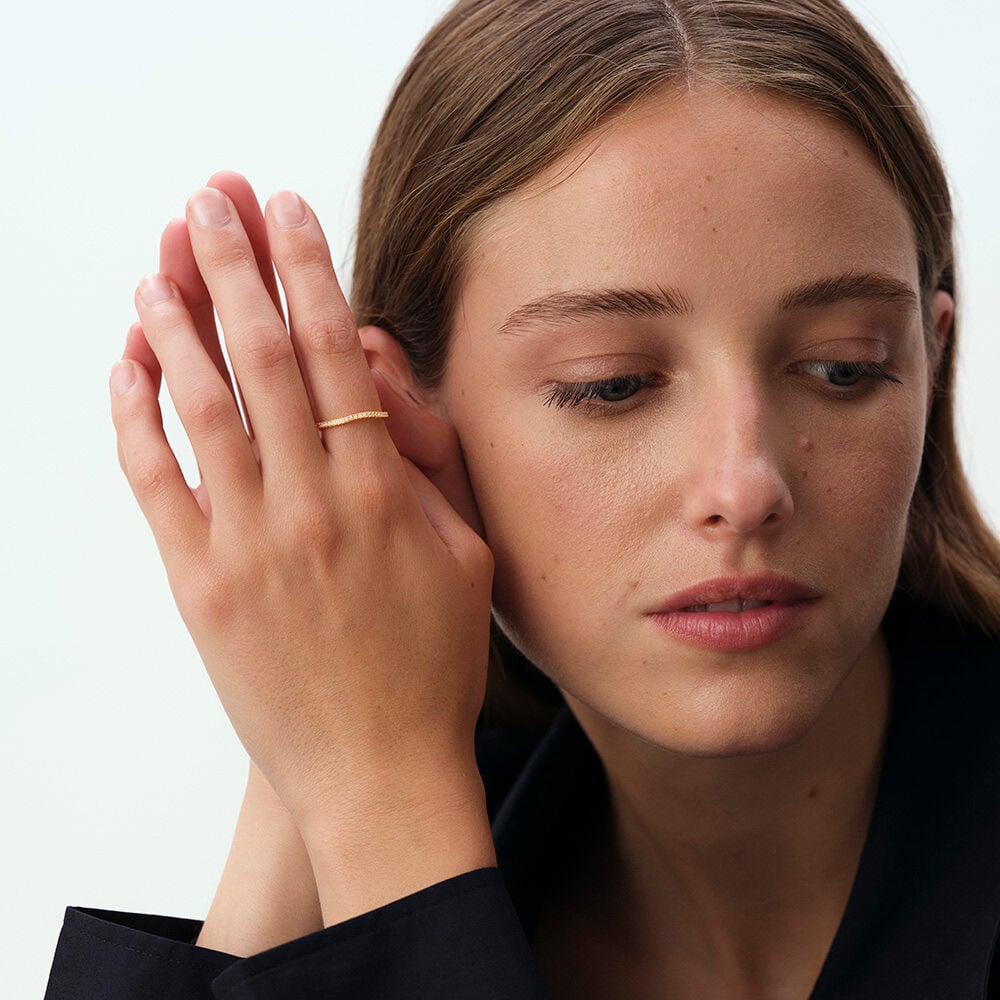 Anillo fino de plata de ley con baño de oro y circonitas en color cristal. Un diseño atemporal que siempre querrás llevar. ¿Buscas un regalo? Con este fondo de armario acertarás seguro.