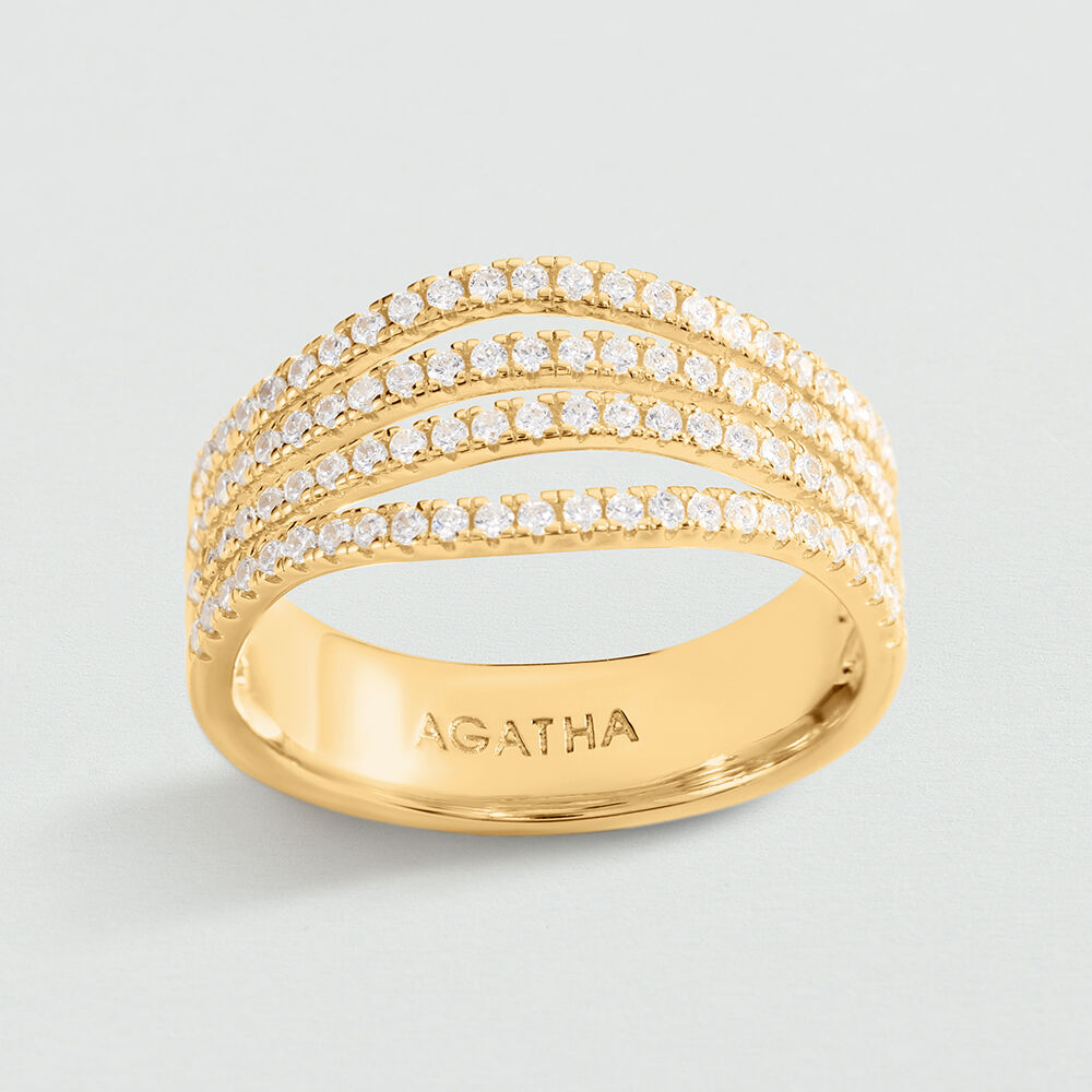 Anillo ancho de plata de ley con baño de oro y 4 tiras de circonitas en color cristal. Un diseño de alta joyería que podrás lucir en tu día a día pero también en tus ocasiones más especiales.
