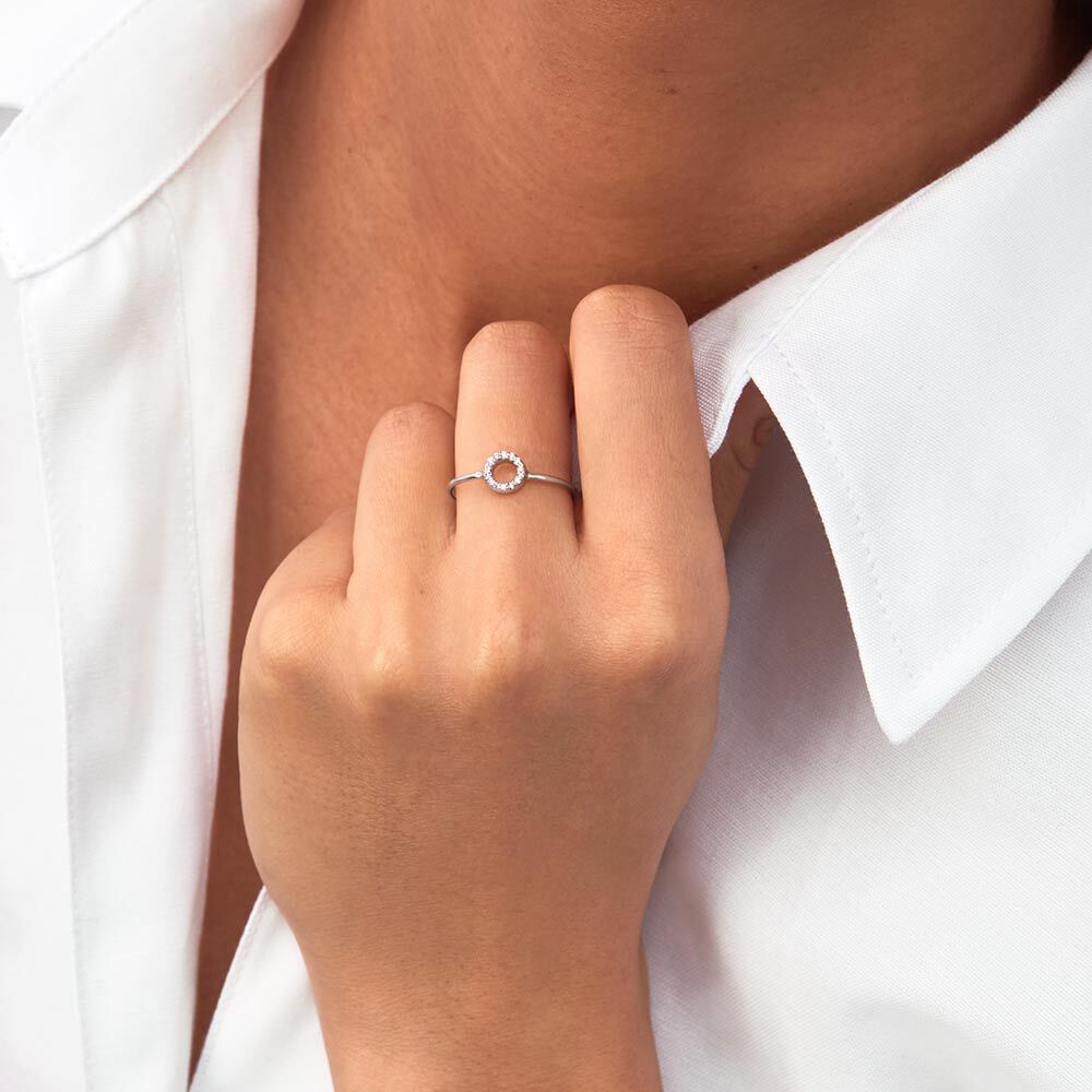 Anillo fino de plata de primera ley con baño de rodio y donut de circonitas. Un clásico revisitado que aportará el toque de luz imprescindible a tus manos y que no te querrás quitar. .