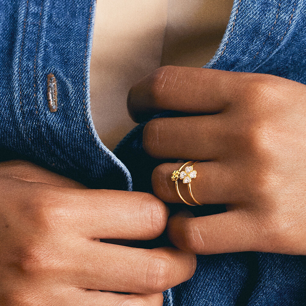 Anillo fino de plata de ley con baño de oro y trébol de circonitas. Un verdadero fondo de armario para no pensar y verte favorecida todos los días. Es una joya ideal para regalar y auto regalarse.