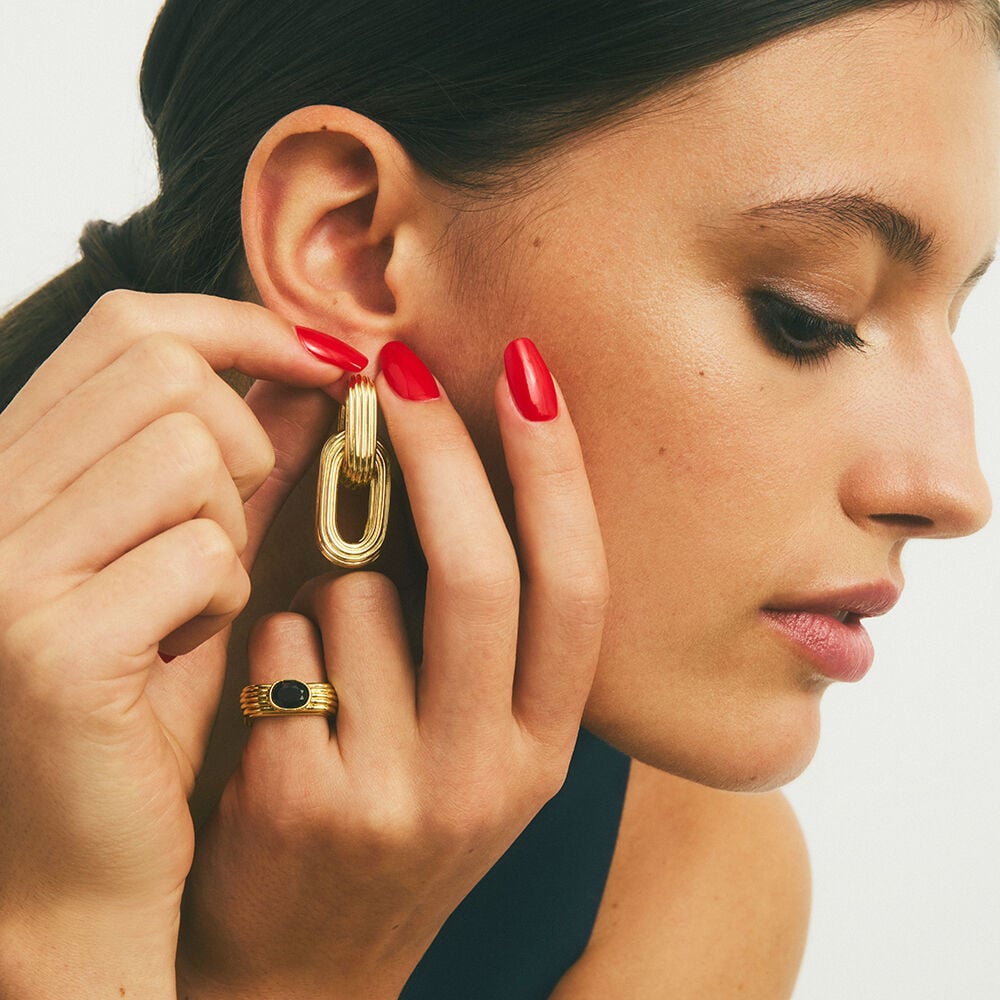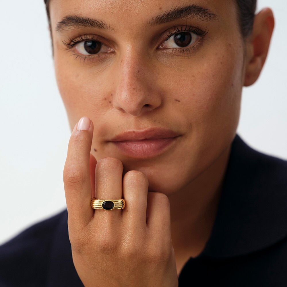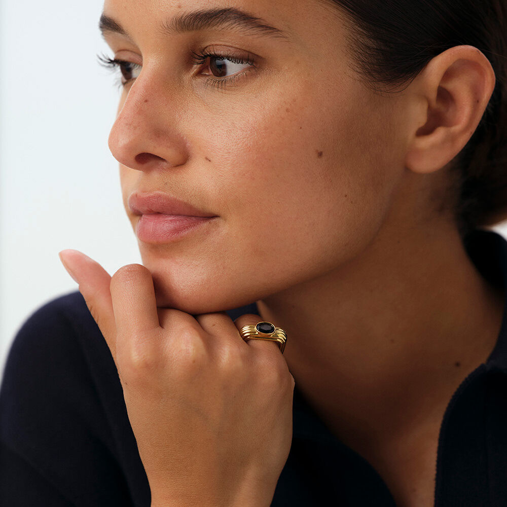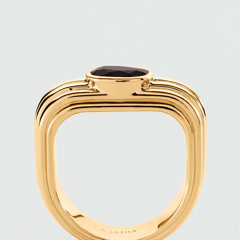 Anillo de meñique texturizado y acabado en oro con circonita marrón en el centro. A través de esta propuesta combinamos las dos tendencias más fuertes de la temporada: los anillos mini y el color marrón. Una pieza indiscutible en tu joyero si quieres estar a la última.