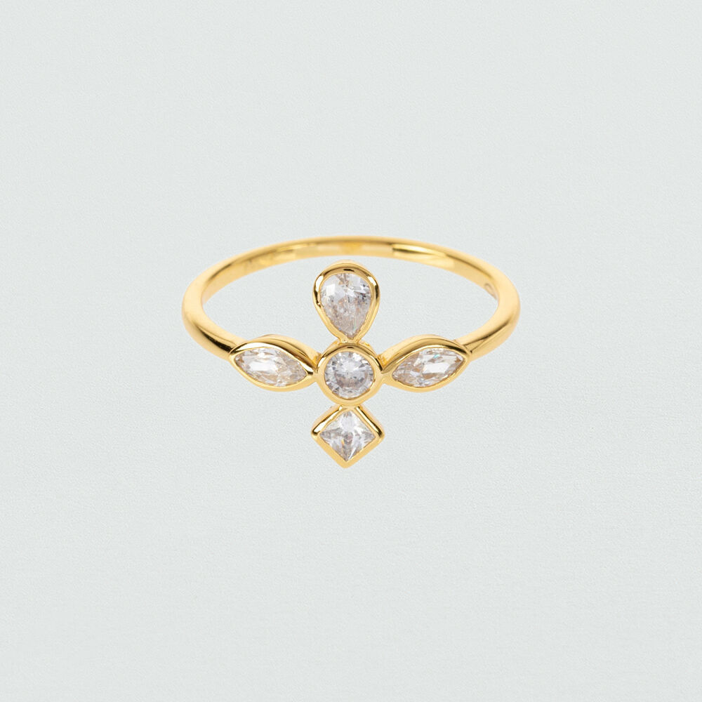 Anillo motivo cruz de circonitas de diferentes formas diseñado por Maria Pombo X Agatha.