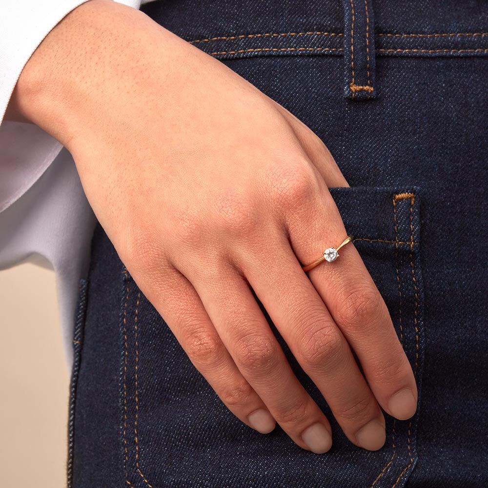 Anillo fino de plata de ley con baño de oro tipo solitario con circonita. Un diseño tan atemporal como ideal para tus celebrar tus ocasiones más especiales.