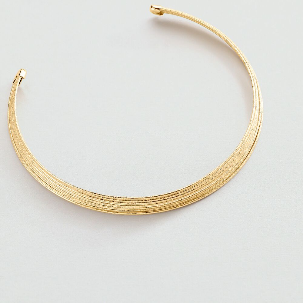 Choker rígido acabado en oro de 18k con multi hilos texturizados. Una joya que acaparará todas las miradas por su originalidad y porque es de lo más favorecedora. La revolución de los chokers ha venido para quedarse y este diseño no defraudará. Potencia la diosa que llevas dentro con lo nuevo de Maria Pombo X Agatha Paris..