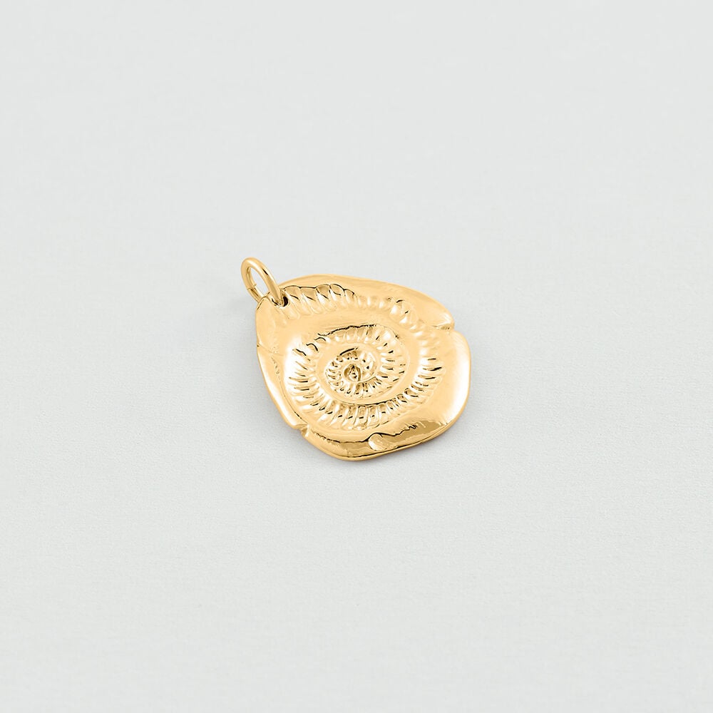 Medalla acabada en oro con caracola grabada. Puedes combinarla con cualquier base y resto de colgantes y personalizar tus joyas sin límite.