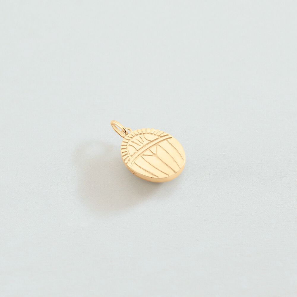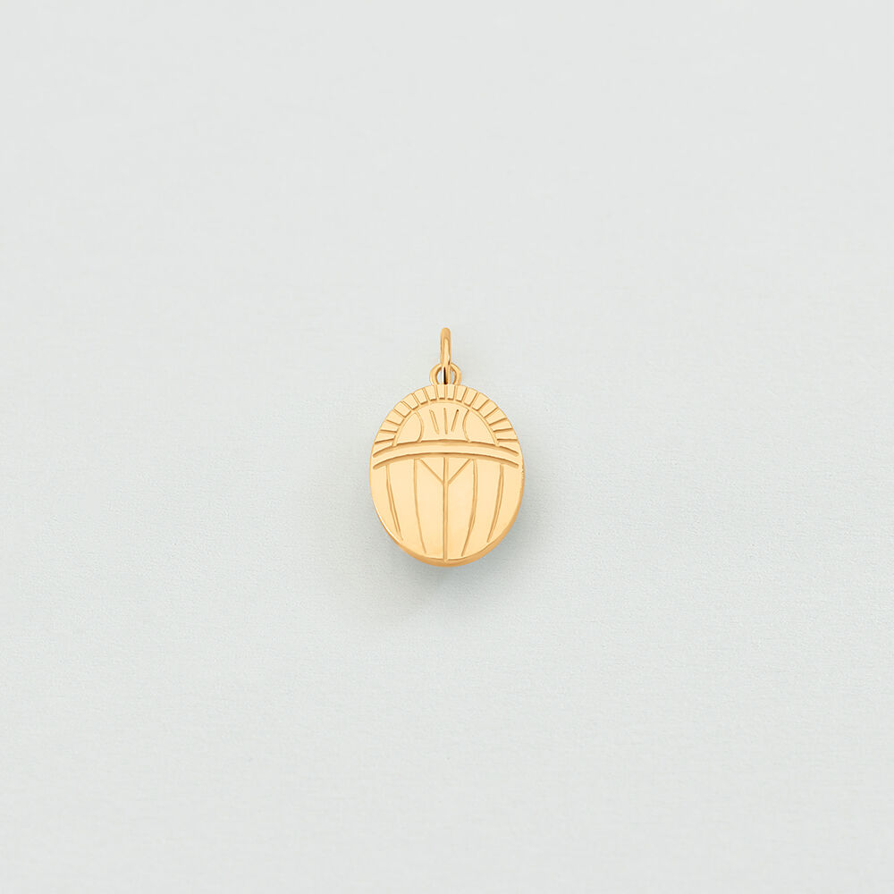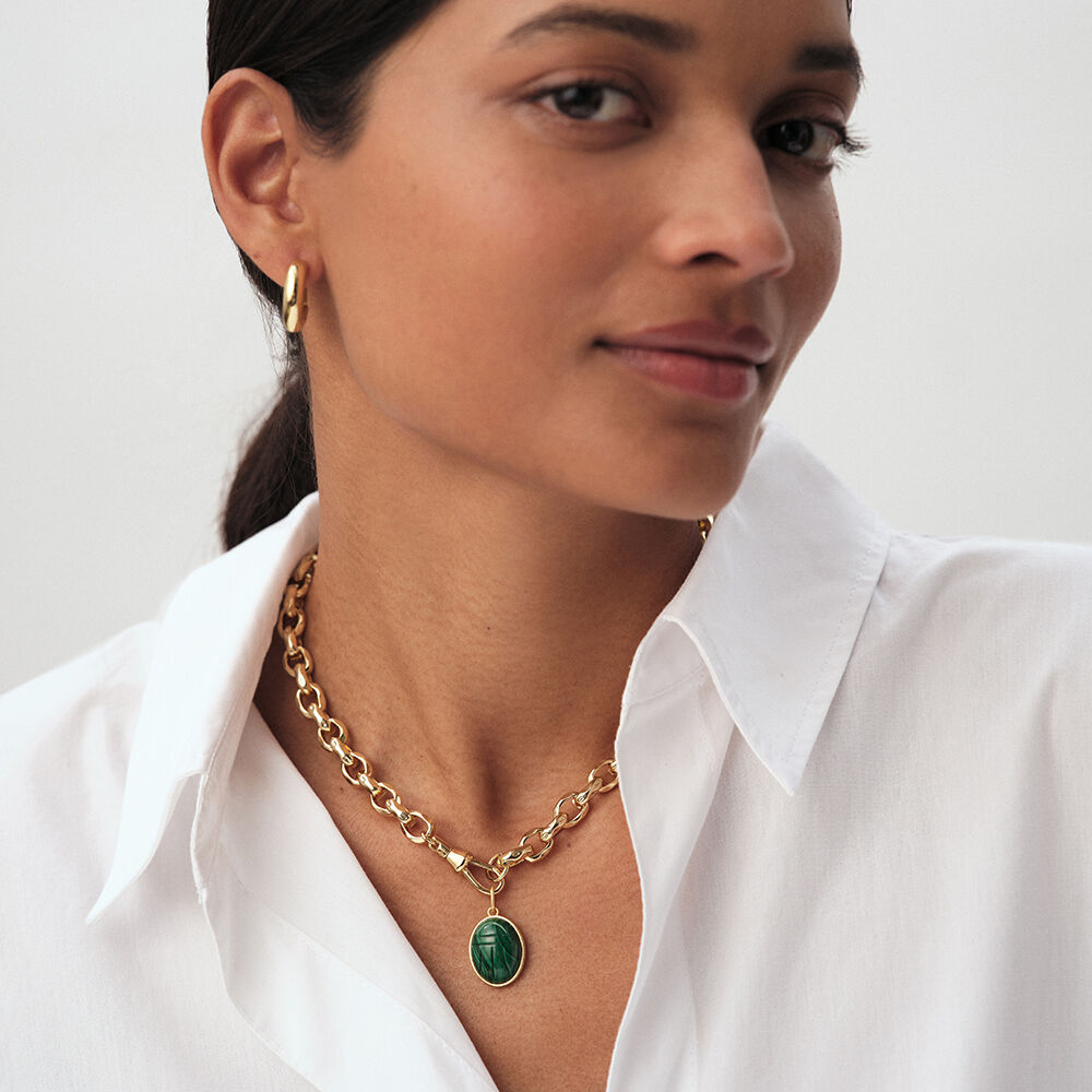 Colgante de latón con baño de oro y malaquita con forma de escarabajo. Un talismán en toda regla que podrás combinar con cualquier base y resto de colgantes y personalizar tus joyas sin límite.