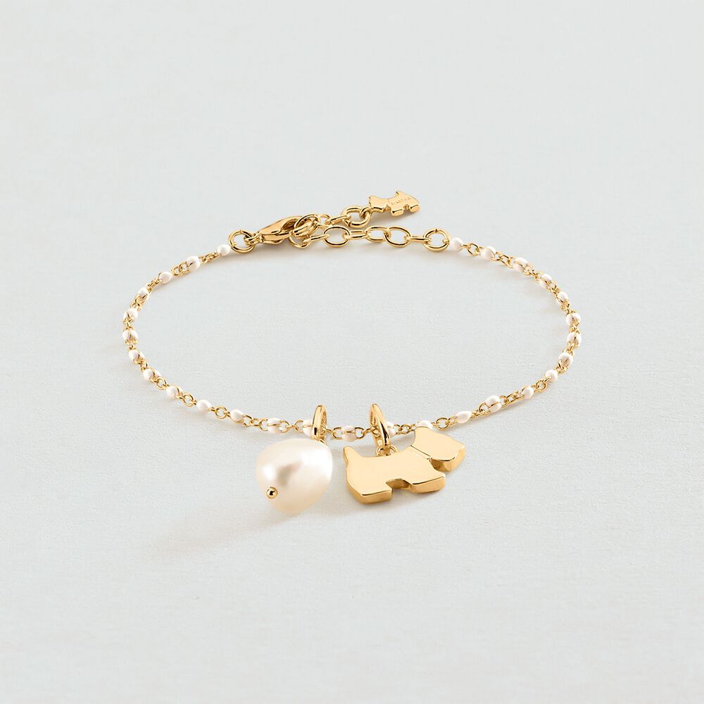 Colgante de rodio acabado en oro con forma de perrito. La mascota de la marca no podía quedar fuera de esta súper propuesta, puedes combinarlo con cualquier base y resto de colgantes y personalizar tus joyas sin límite.