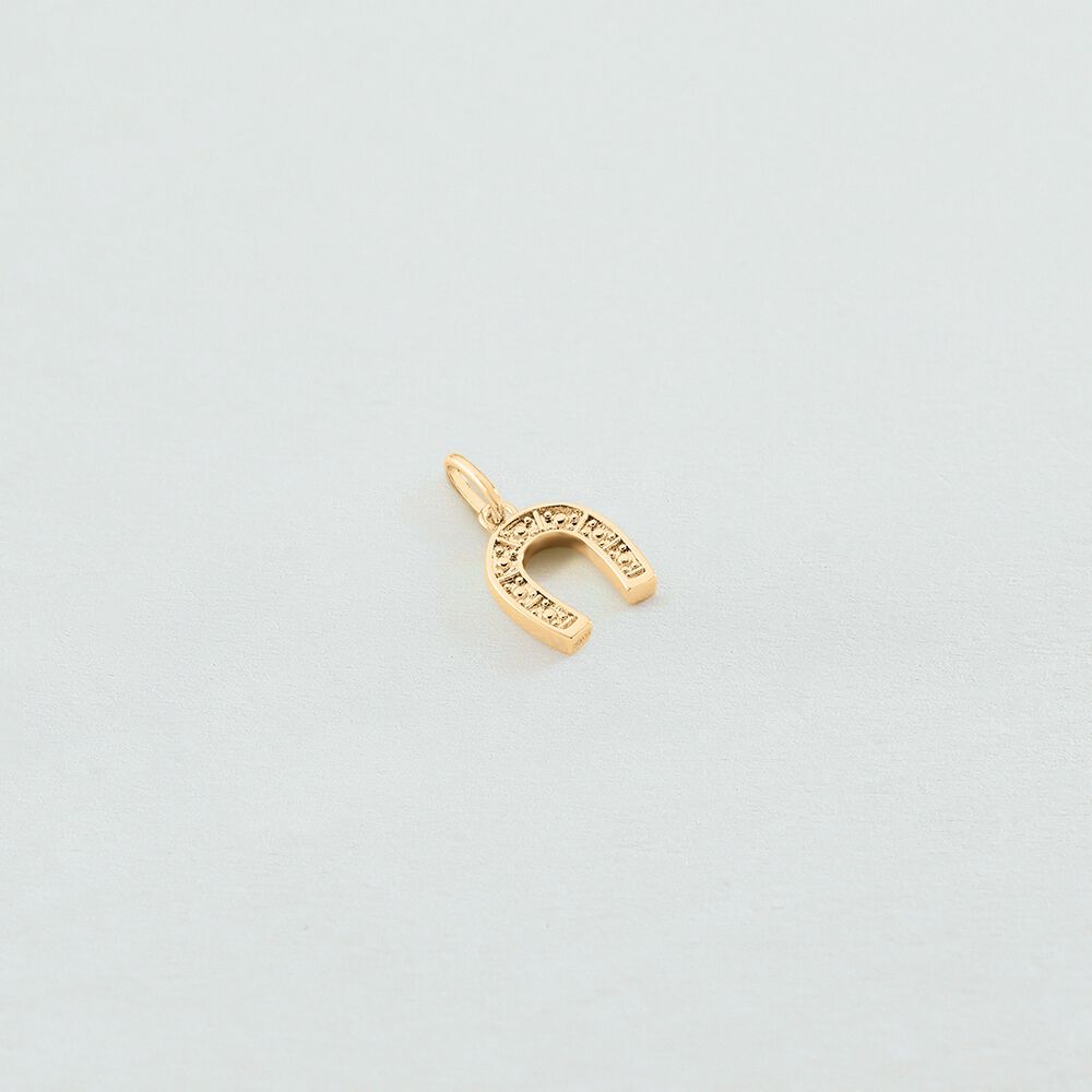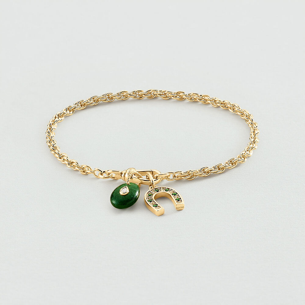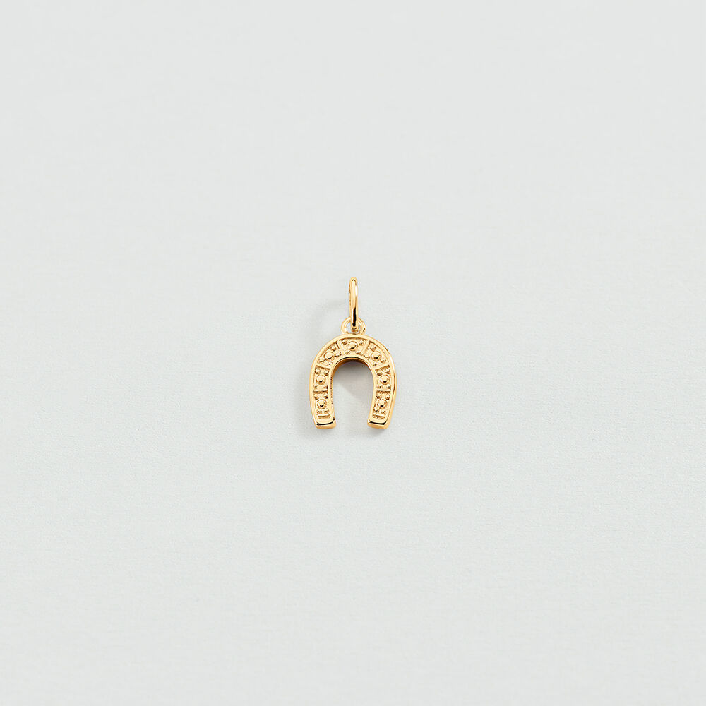 Colgante de rodio acabado en oro con forma de herradura y circonitas verdes. Un amuleto en toda regla que aportará un toque de color muy gustoso a tus días. Puedes combinarlo con cualquier base y resto de colgantes y personalizar tus joyas sin límite.