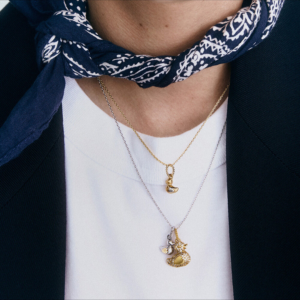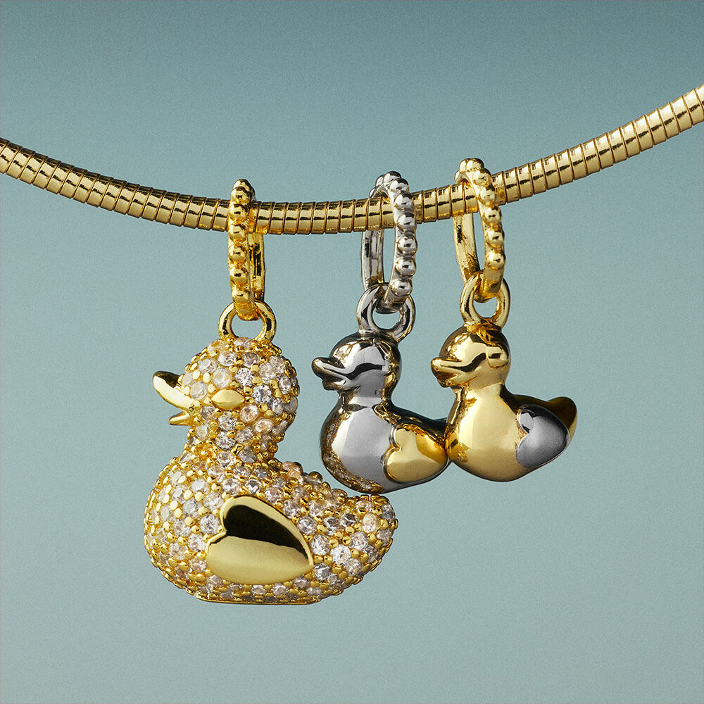 Un amuleto que representa la gran aventura de la vida que es tener hijos.Los patitos siempre están cerca del calor y la protección de su mamá pata.Acumula tantos patitos como quieras y luce a tu tribu con orgullo. Crea tu collar personalizado con los amuletos de moda de la nueva colección de Maria Pombo X AGATHA. Joya acabada en oro y rodio..