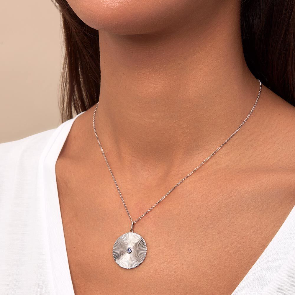 Colgante redondo rayo de sol y circonita central de la colección María Pombo X Agatha Paris.