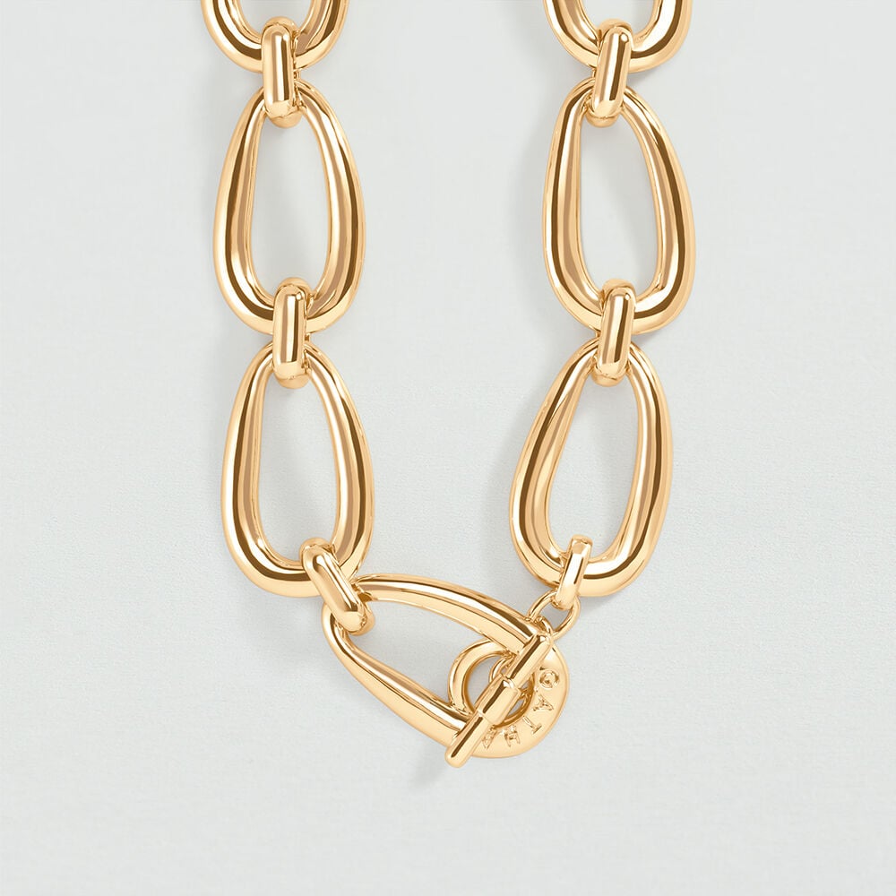 Collar corto acabado en oro de eslabones. Si buscas esa joya que te pondrás todos los días, con la que verte muy favorecida y que combine con absolutamente toda tu ropa, es esta. Las mallas son tendencia absoluta y este diseño se convertirá en tu segunda piel.Posibilidad de comprar una extensión en nuestra página web para poder llevarlo más largo alrededor del cuello. Referencia : 03880002-157-TU