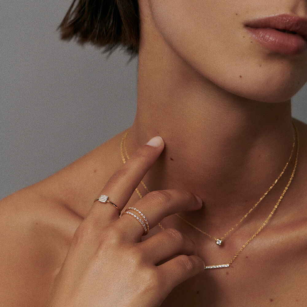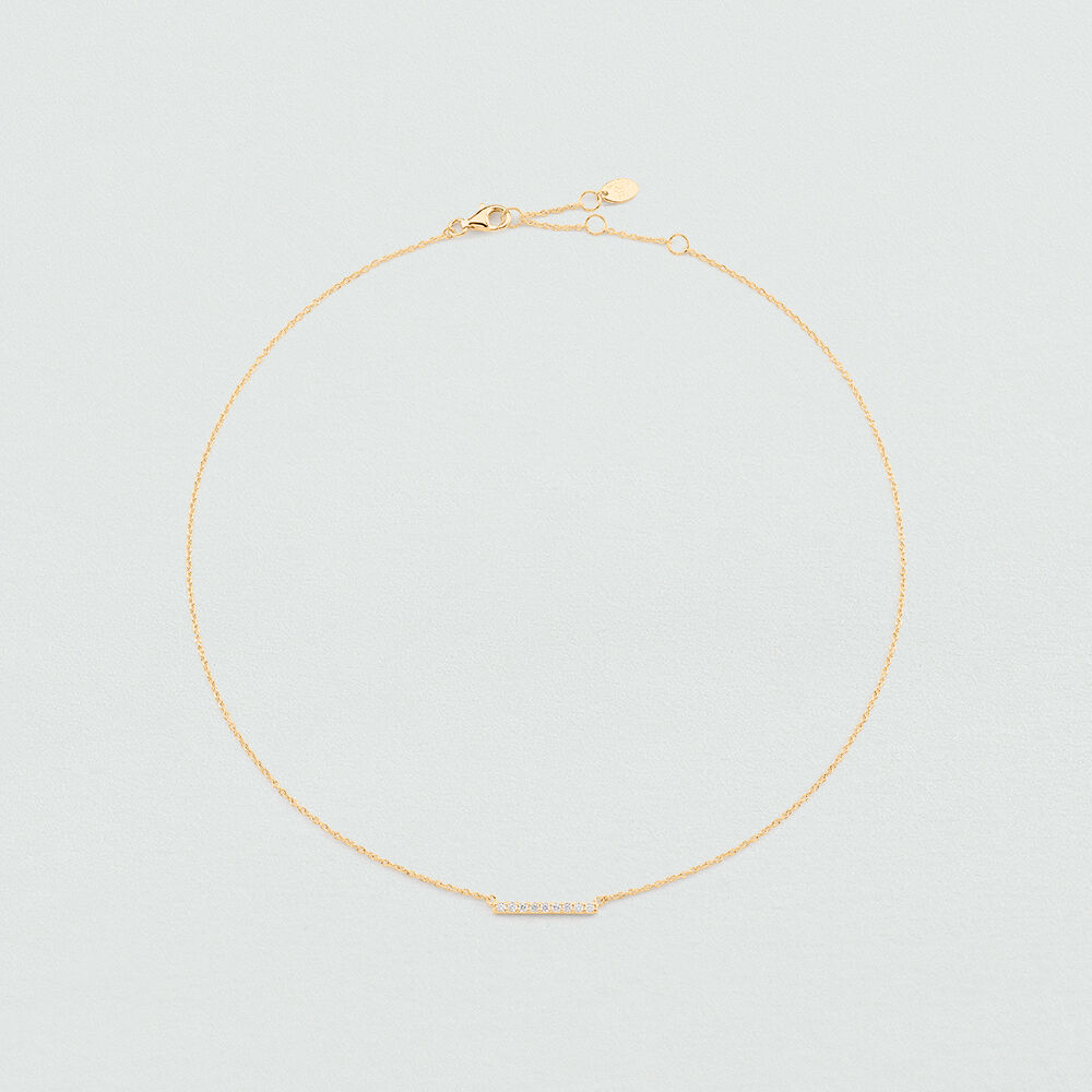 Collar corto de plata de ley con baño de oro con colgantito en forma de barrita con circonitas. Un fondo de joyero que no te puedes perder porque te sacará de cualquier apuro.