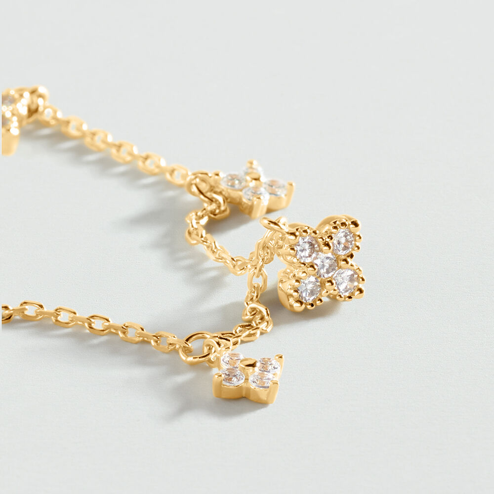 Collar de plata de ley bañado con 1 micra de oro de 18k y mini colgantes con circonitas en forma de flor. Llevable, combinable y tendencia, ¡el mix perfecto! Solo te queda decidir si prefieres la versión más neutra con circonitas blancas o el push de color definitivo para todos tus looks con las circonitas de colores. Esta joya mide 420 mm con un alargo extra de 50 mm