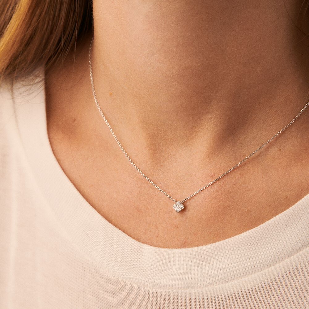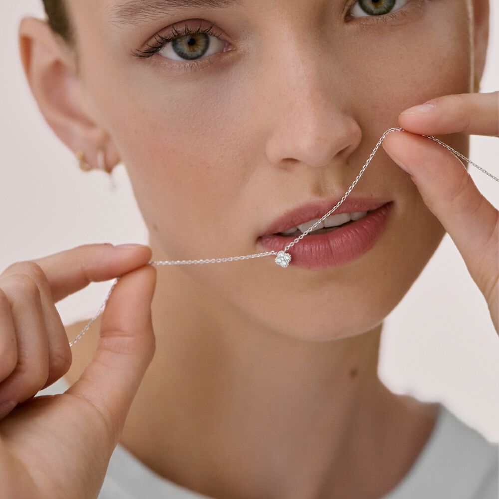 Collar corto de plata de ley con mini colgante de circonitas, tú decides si en color cristal para una opción más neutra o en color azul para un twist definitivo. El toque exacto de brillo y luz para tu día a día, no te quedes sin él. Esta joya mide 375mm y tiene un alargo de 50mm