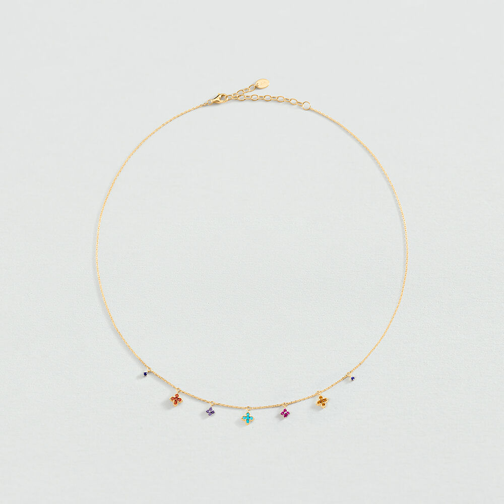 Collar de plata de ley bañado con 1 micra de oro de 18k y mini colgantes con circonitas en forma de flor. Llevable, combinable y tendencia, ¡el mix perfecto! Solo te queda decidir si prefieres la versión más neutra con circonitas blancas o el push de color definitivo para todos tus looks con las circonitas de colores. Esta joya mide 420 mm con un alargo extra de 50 mm