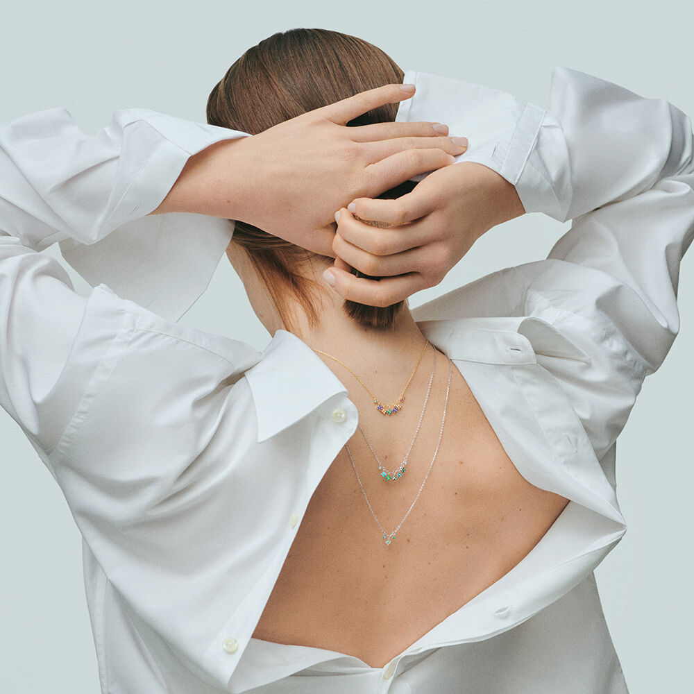Collar corto de plata de ley y multi pampillas de colores. Una propuesta que aporta luz y color a tus looks de una forma sutil y sofisticada.