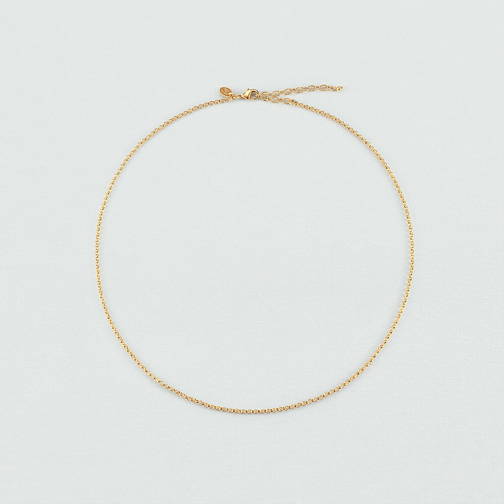 Cadena corta de rodio acabado en oro de eslabones redondos. Una opción delicada y con mucho estilo para llevar tus colgantes favoritos. Una joya personalizable que puedes ir transformando y llevar un collar diferente cada día. Esta joya mide 350mm y tiene un alargo de 50mm