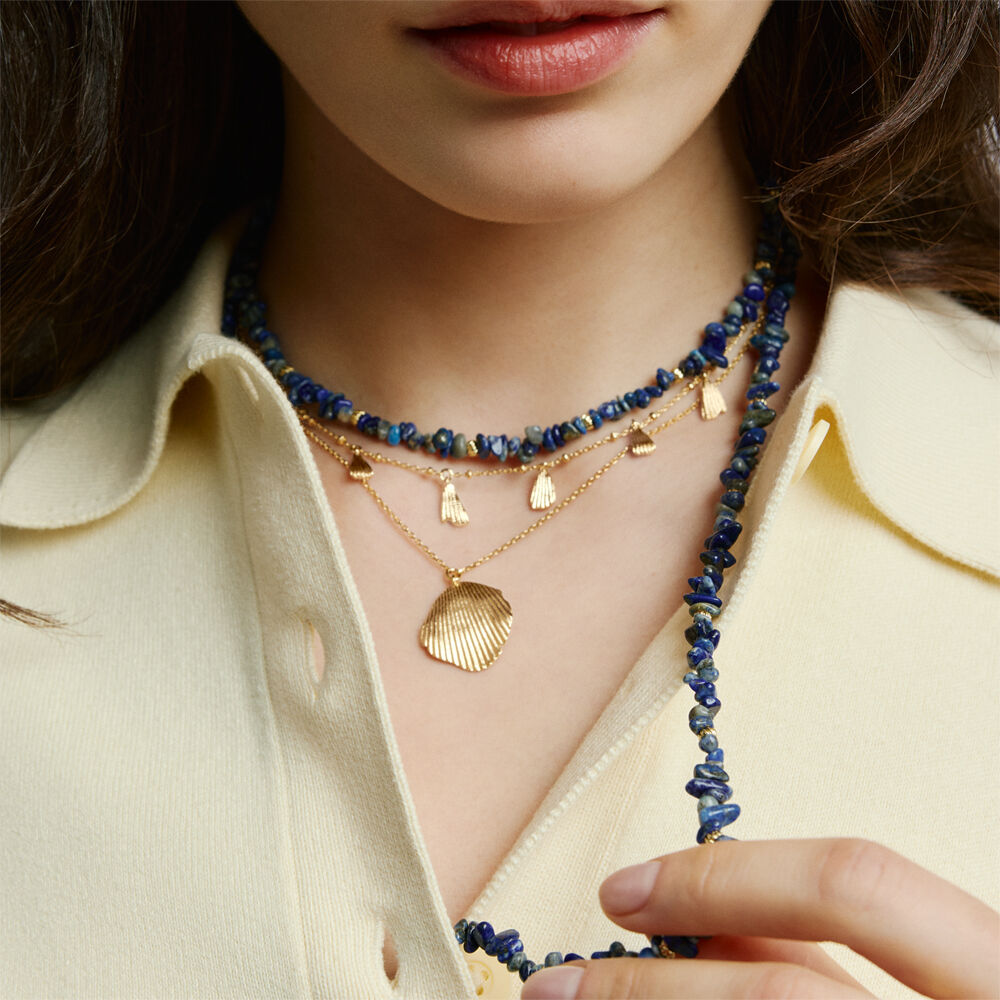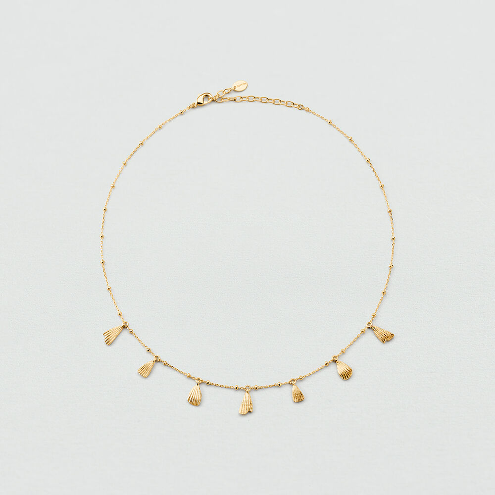 Collar corto acabado en oro y pampillas en formas orgánicas y texturizadas. Un collar fácil, favorecedor y que aporta luz al rostro. Combínalo con la pulsera a juego para conseguir un look espectacular y lleno de estilo. Esta joya mide 375 mm con un alargo extra de 50 mm