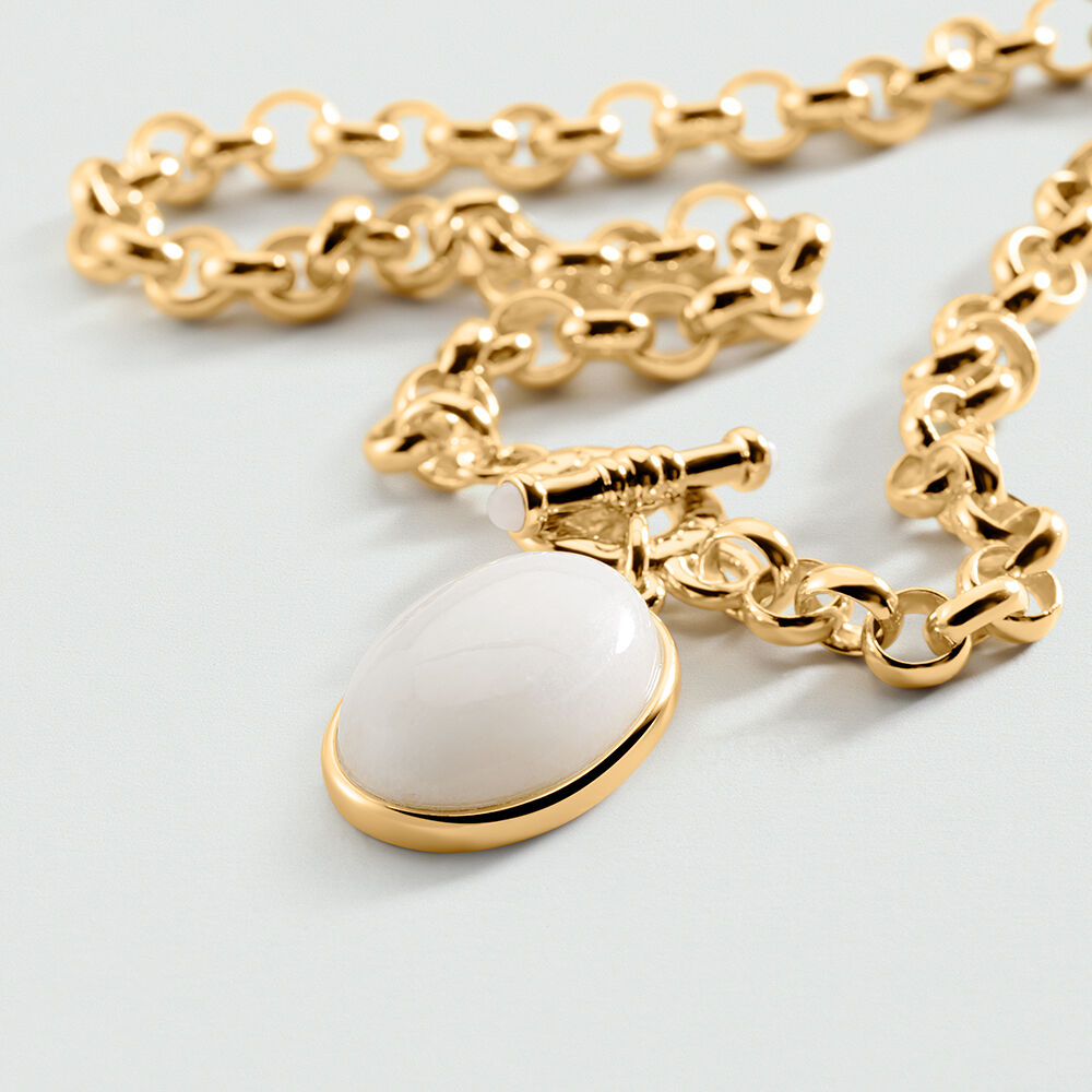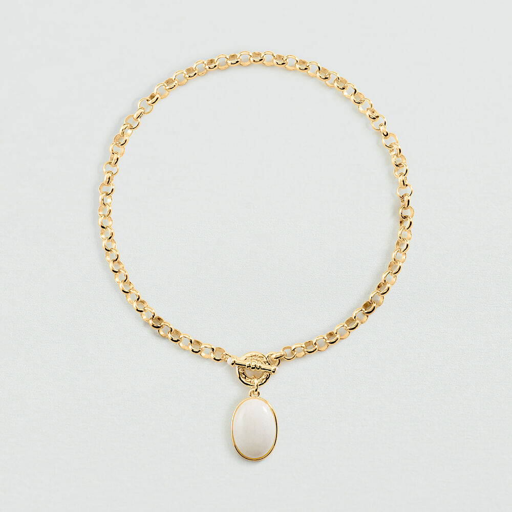 Collar corto de cadena de eslabón acabado en oro, con cierre delantero de bâton y un colgante de piedra natural blanca. Es una joya con carácter que destaca por su elegancia, ideal para regalar en una ocasión especial.