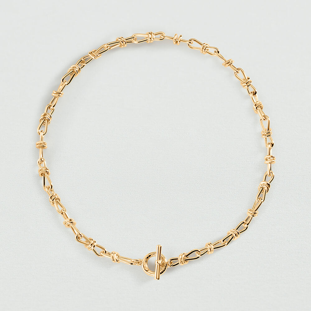Cadena corta tipo malla con nudos acabada en oro y con cierre delantero de bâton. Una base perfecta para añadir tus colgantes favoritos para coleccionar. Talismans es un concepto para crear las joyas que más te representen y se adapten a tu look. Elige tu base, añade tus colgantes favoritos y a disfrutar.