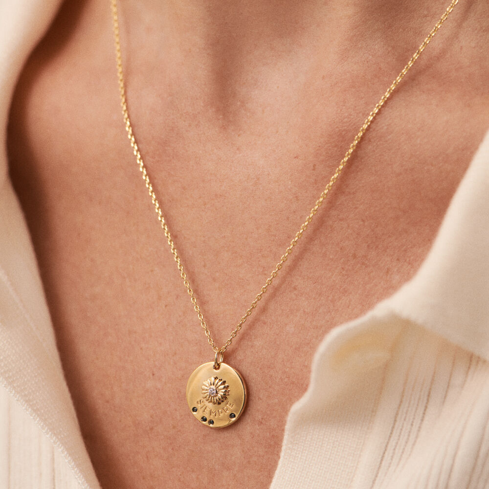 Collar corto acabado en oro con colgate redondo y circonitas. El colgante lleva grabada una margarita y la palabra 'siempre'. Ideal para llevar a esa persona o momento especial en tu vida siempre contigo. Déjate seducir por la magia de la nueva colección de Sara Carbonero para Agatha Paris.