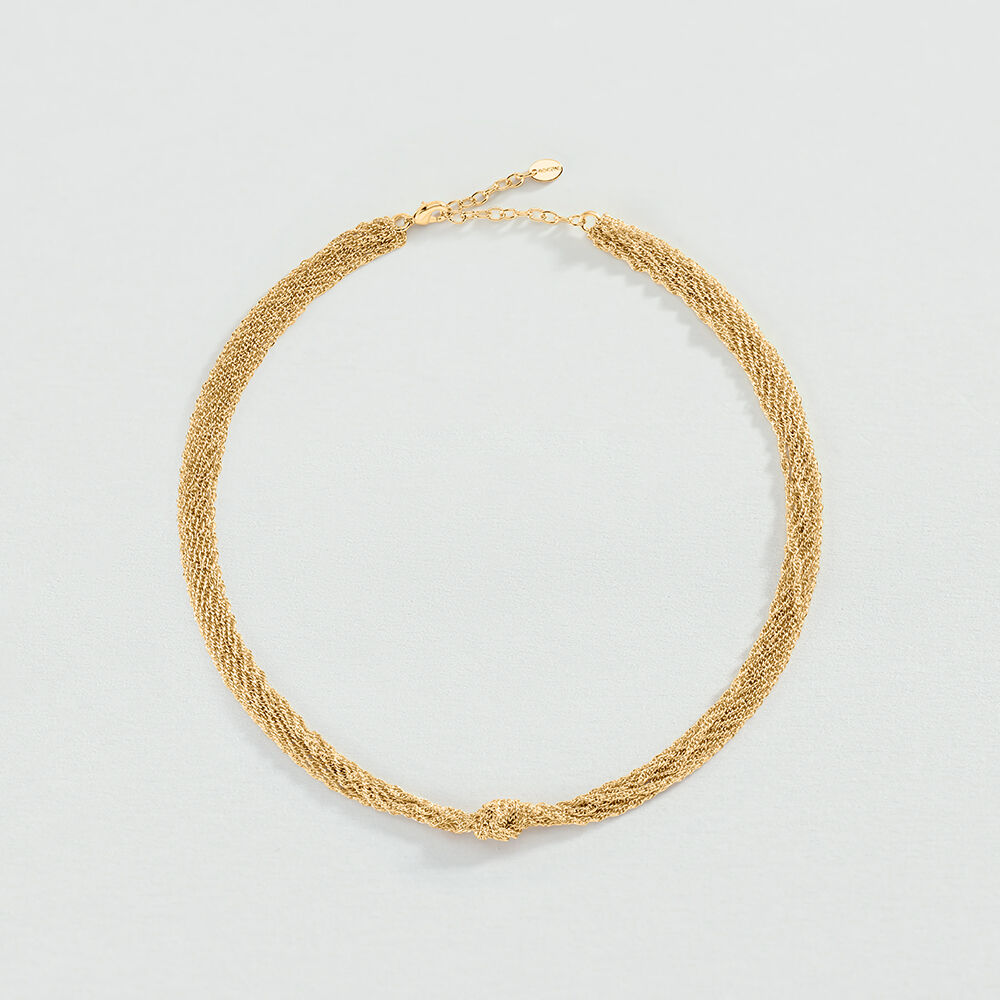 Collar corto acabado en oro con muchas cadenas y nudo central. Una propuesta súper original que no te querrás quitar. Esta joya mide 400mm y tiene un alargo de 50mm