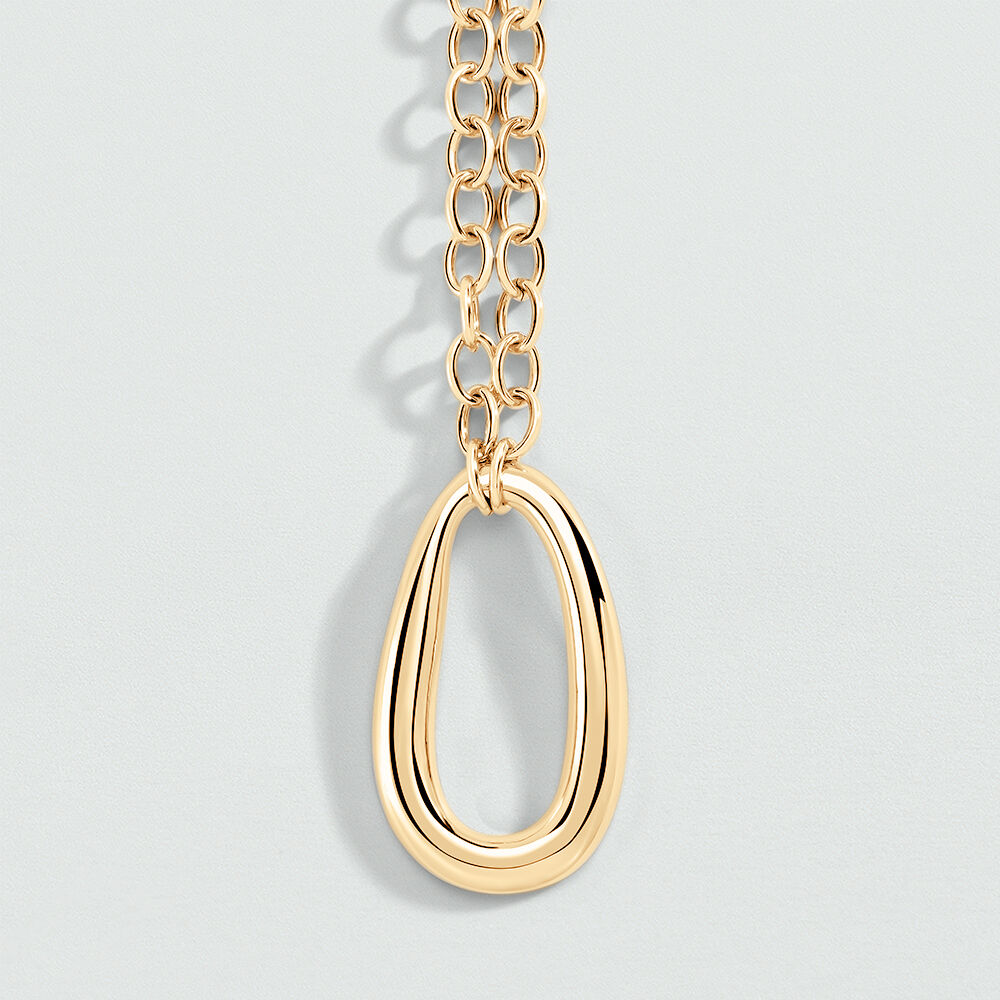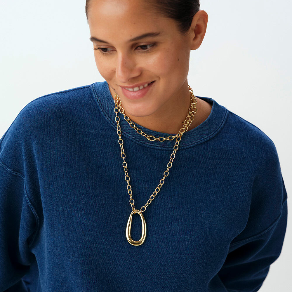 Collar largo acabado en oro con colgante en forma de eslabón. Una propuesta desenfadada para lucir toda la temporada. ¿Quieres un total look de infarto? Combínalo con otros collares de la colección más cortos.