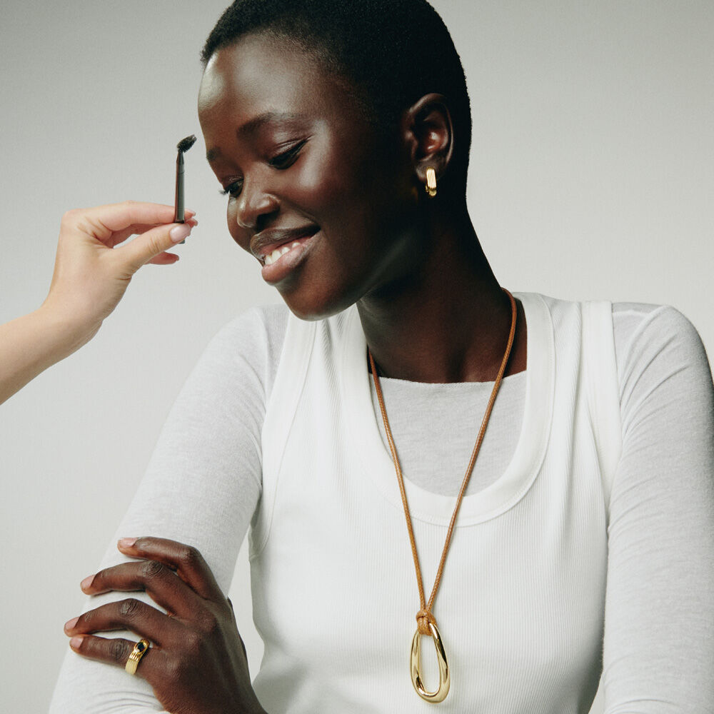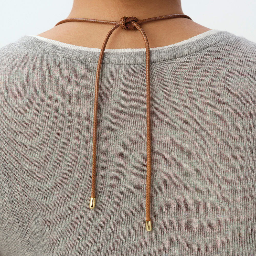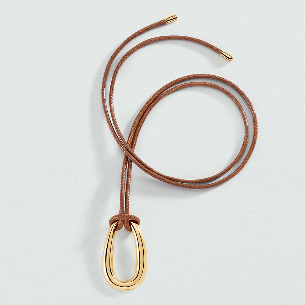 Collar largo de cuero con colgante acabado en oro con forma de eslabón. Una propuesta desenfadada para lucir toda la temporada. ¿Quieres un total look de infarto? Combínalo con otros collares de la colección más cortos.