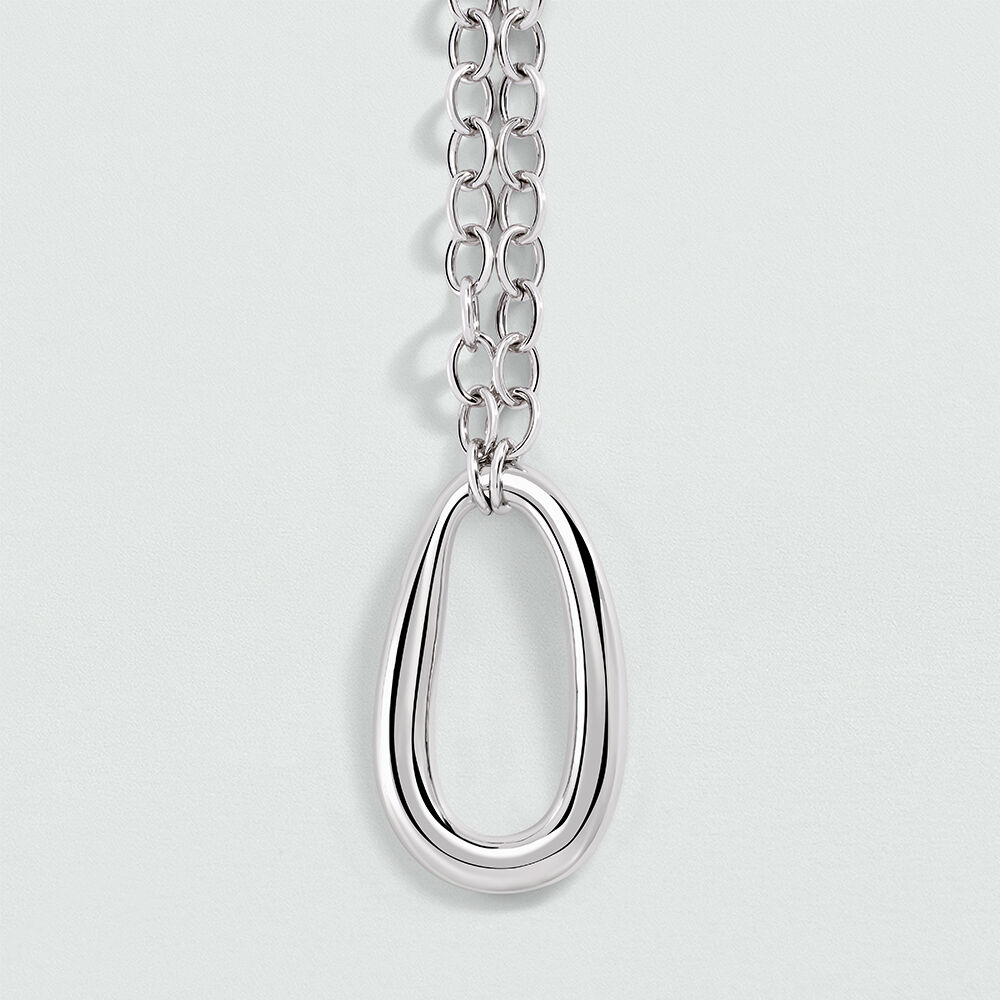 Collar largo acabado en rodio con colgante en forma de eslabón. Una propuesta desenfadada para lucir toda la temporada. ¿Quieres un total look de infarto? Combínalo con otros collares de la colección más cortos.