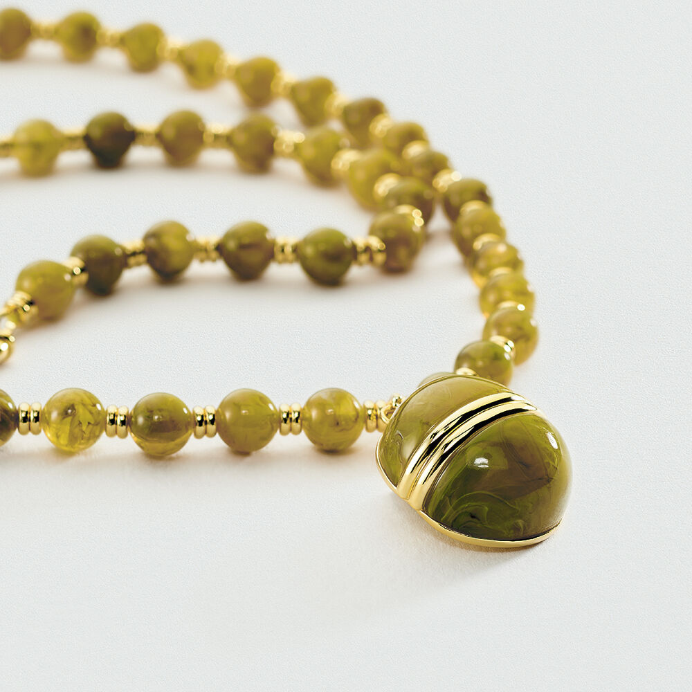 Collar largo de acetato en color verde con cabujón a tono. Un collar de este estilo dará personalidad a todos tus outfits y atrapará todas las miradas. Combínalo con las criollas y el anillo a tono para un total look de infarto. Be by Maria Pombo habla de ser y de estar. De ser tú misma y poder estar donde quieras. Joyas para sentirte bien y joyas para llevar dónde necesites: en tu día a día, a la oficina, a tus momentos más especiales, en casa, cuando quedes con tus amigas o hagas un plan que te apetezca.
