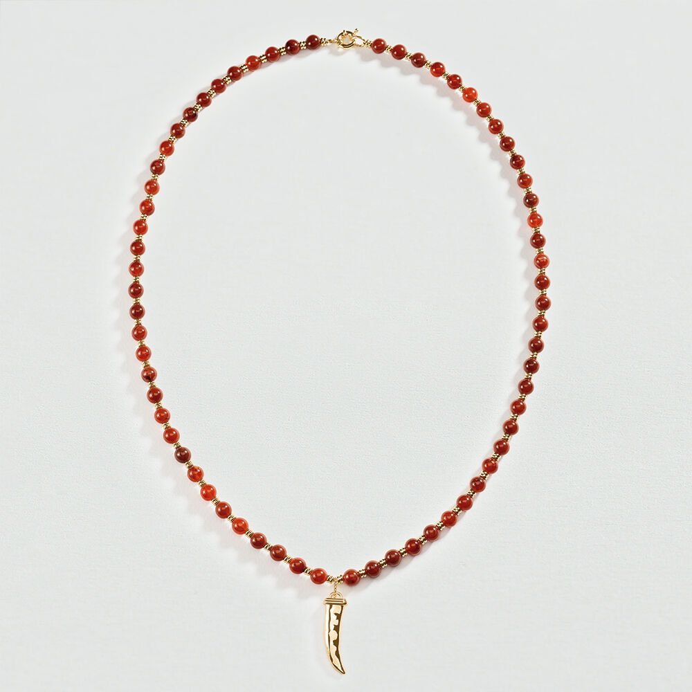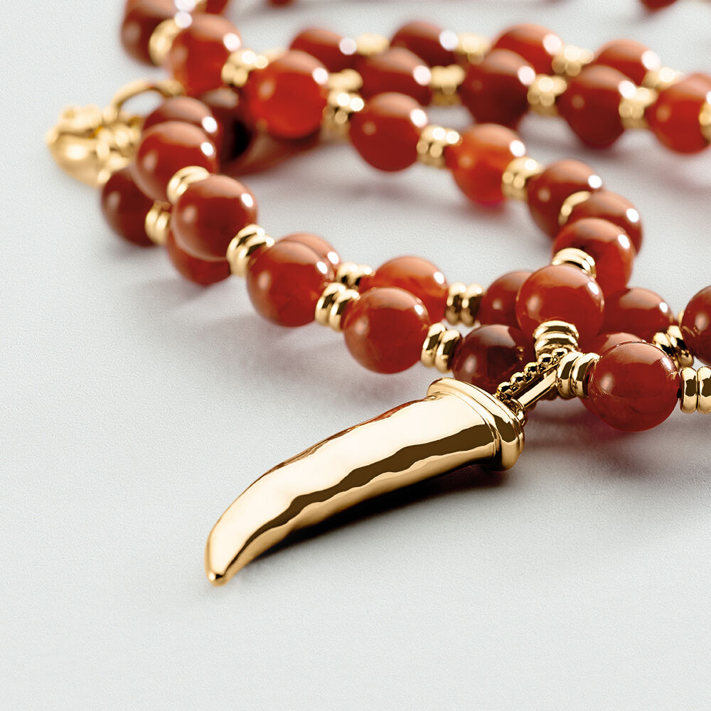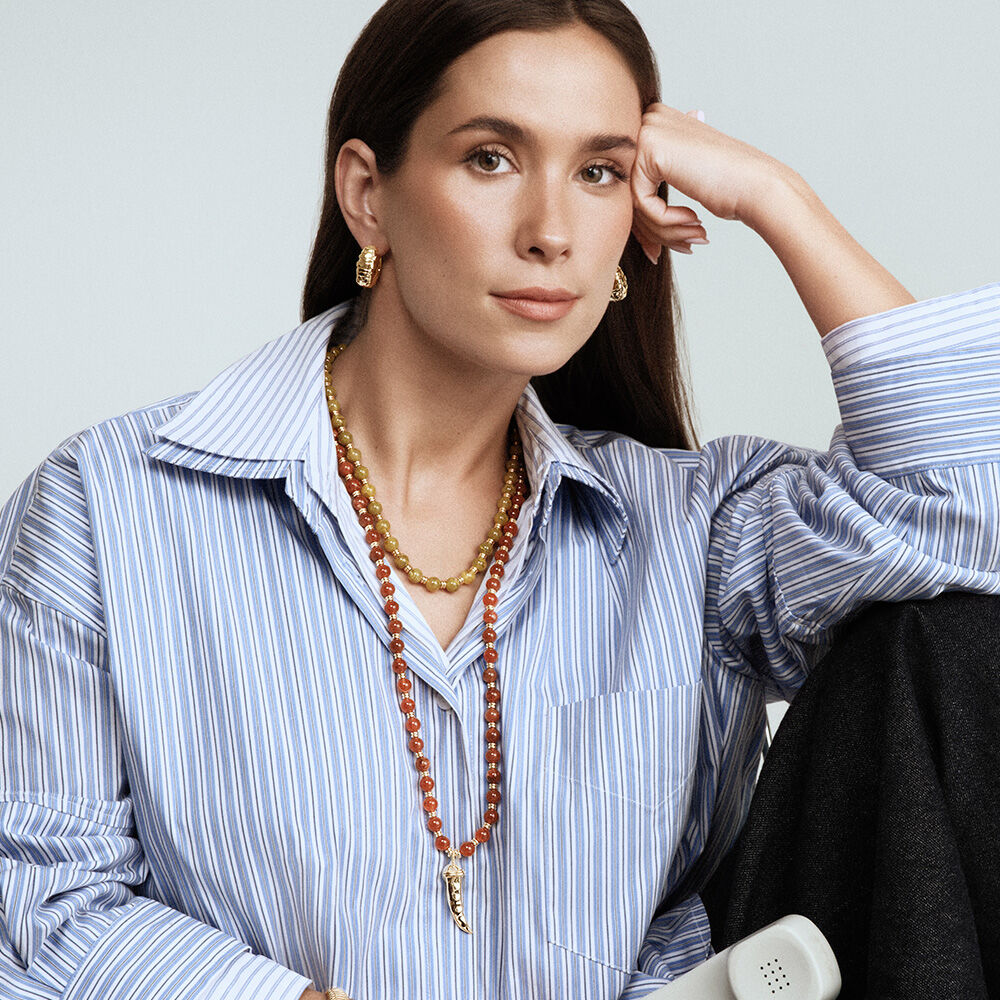 Collar largo de acetato en color tierra con cuerno de la abundancia en dorado. Un collar de este estilo dará personalidad a todos tus outfits y atrapará todas las miradas. Un amuleto para elevar tus estilismos al infinito y no pensar en nada más. Combínalo con las criollas y el anillo a tono para un total look de infarto. Be by Maria Pombo habla de ser y de estar. De ser tú misma y poder estar donde quieras. Joyas para sentirte bien y joyas para llevar dónde necesites: en tu día a día, a la oficina, a tus momentos más especiales, en casa, cuando quedes con tus amigas o hagas un plan que te apetezca.