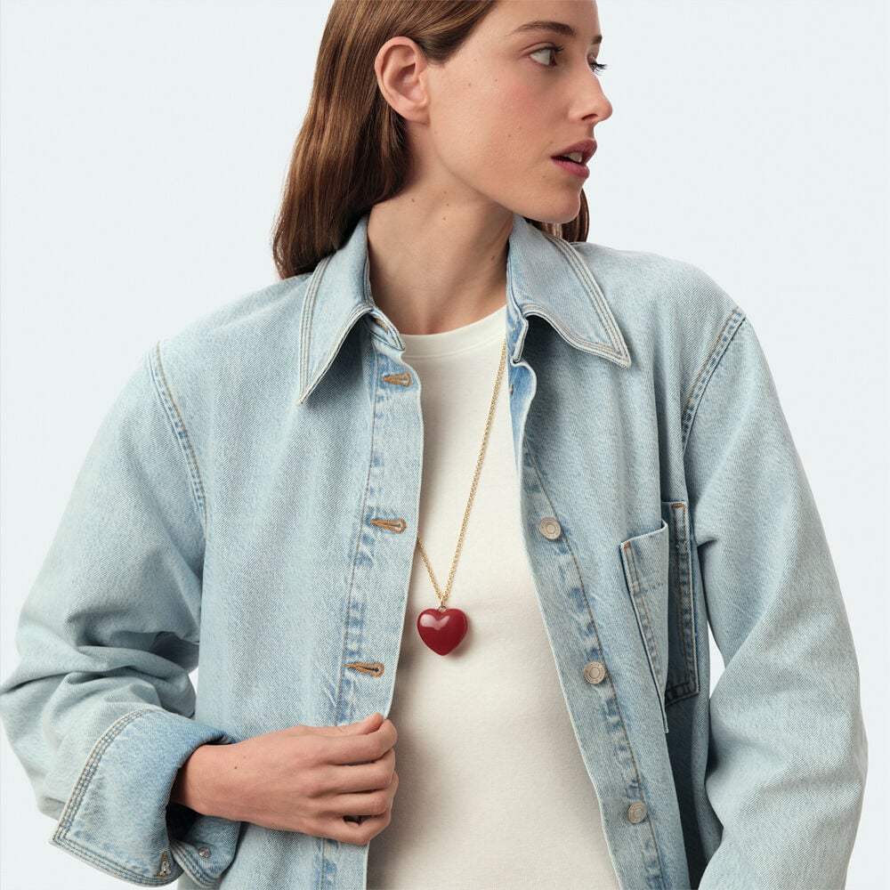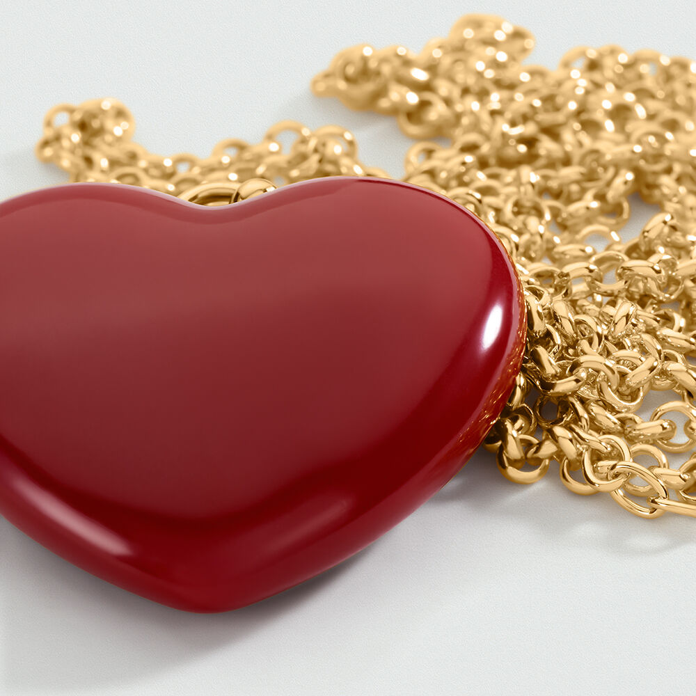 Collar midi acabado en oro y colgante en forma de corazón en resina de color rojo. Un toque de color para tu día a día que favorece mucho y levanta cualquier outfit. ¡Los corazones están de moda! Esta joya mide 650 mm con un alargo extra de 50 mm