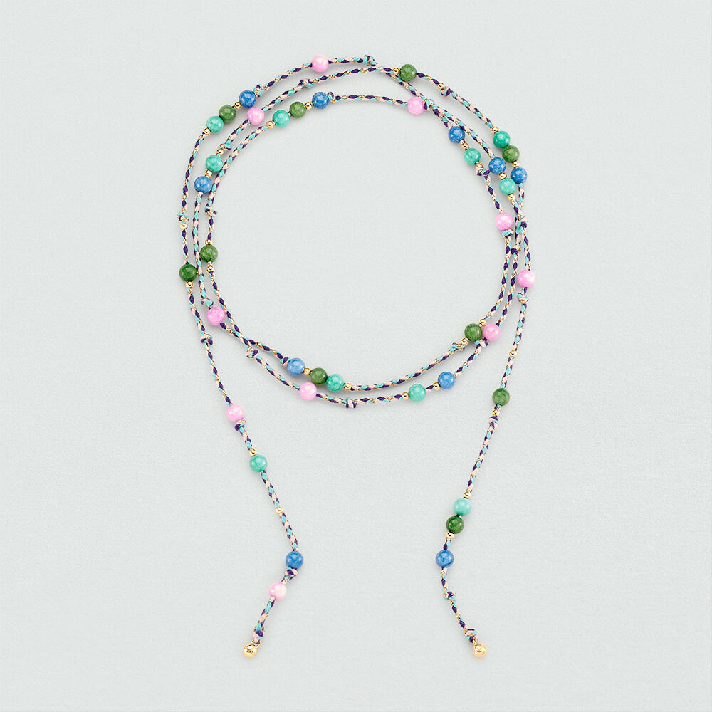 Joya 2 en 1 que sirve tanto para collar como para pulsera. Esta cuerda con bolitas doradas y de colores salteadas te la puedes poner como quieras y es el complemento perfecto para tus joyas doradas favoritas. La flor de Tiaré es una flor tahitiana que florece a la vez que el verano: de mayo a septiembre. Disfruta de la mejor época del año en forma de joya con la nueva colección de Maria Pombo X Agatha.