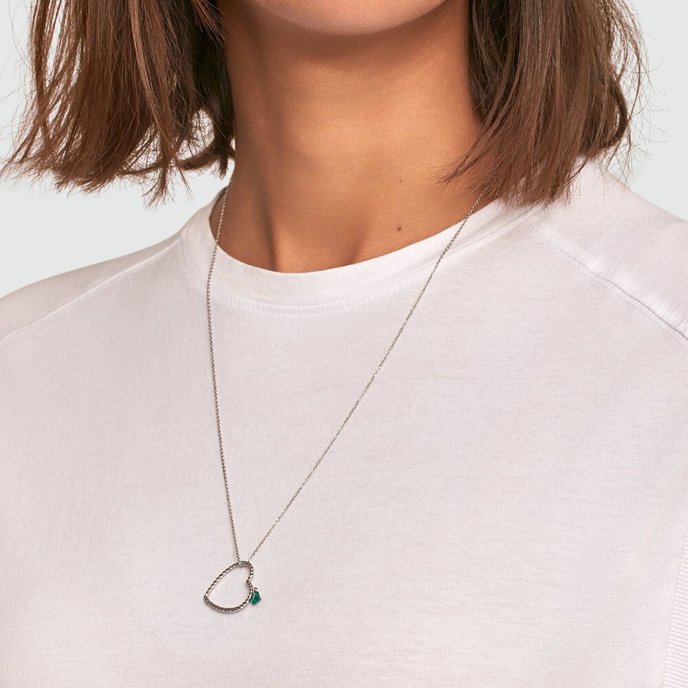Collar semi largo de plata de ley con un colgante en forma de corazón hueco al que le cuelga un corazón de circonita verde. Heart lovers, esta es vuestra colección, una oda al amor que podréis llevar a diario y que aportará luz y color a vuestras jornadas.