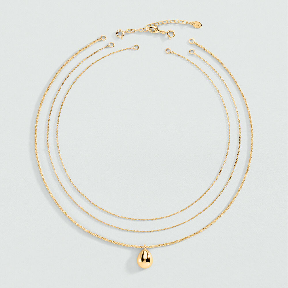 Collar corto acabado en oro, con tres cadenas y un colgante central de resina en forma de gota. Es una joya 3 en 1, ya que todas las cadenas son de quita y pon. Una joya muy versátil y muy fácil de combinar, que aporta un toque chic para hacer brillar cualquier outfit. Esta joya mide 375 mm con un alargo extra de 50 mm