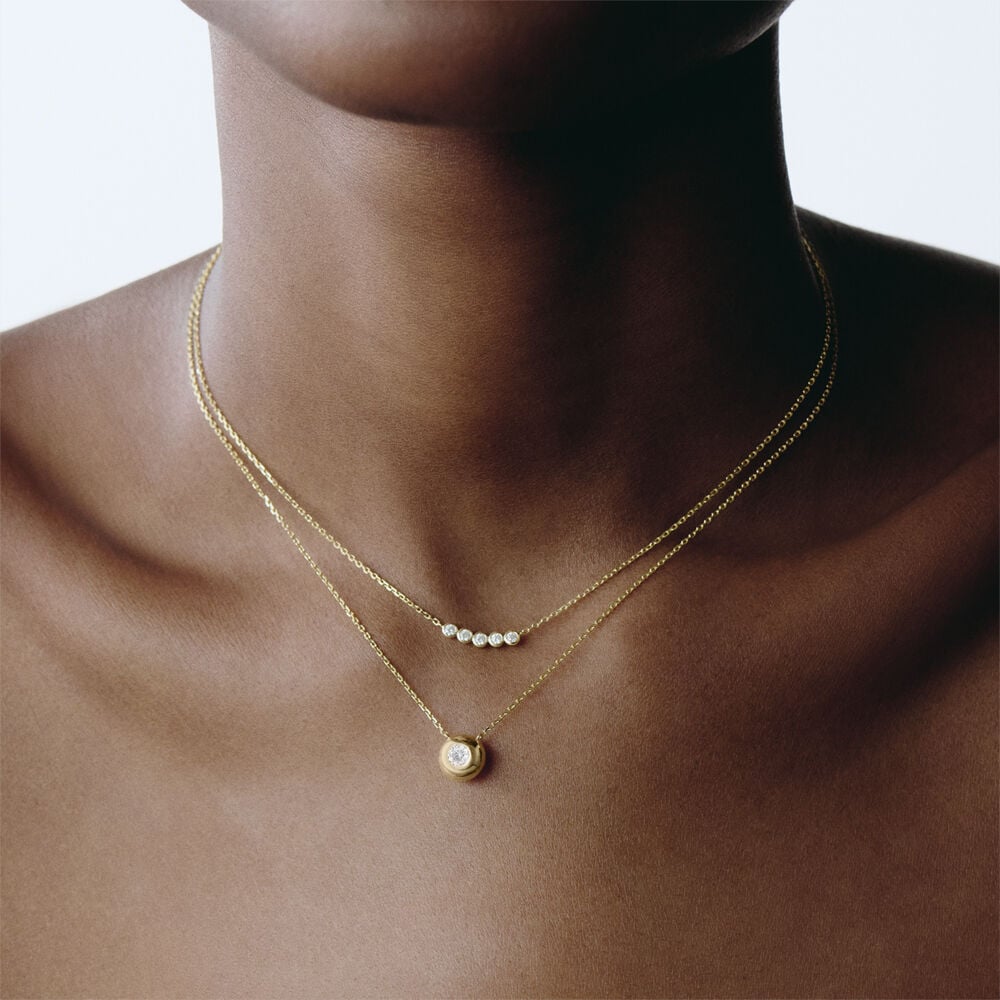 Collar corto de plata de ley y baño de oro con tira de circonitas redondas, tú decides si las quieres en color cristal o verde. Un verdadero fondo de joyero que te ayudará a verte de lo más favorecida todas las mañanas, aporta un montón de luz. Esta joya mide 375 mm con un alargo extra de 50 mm