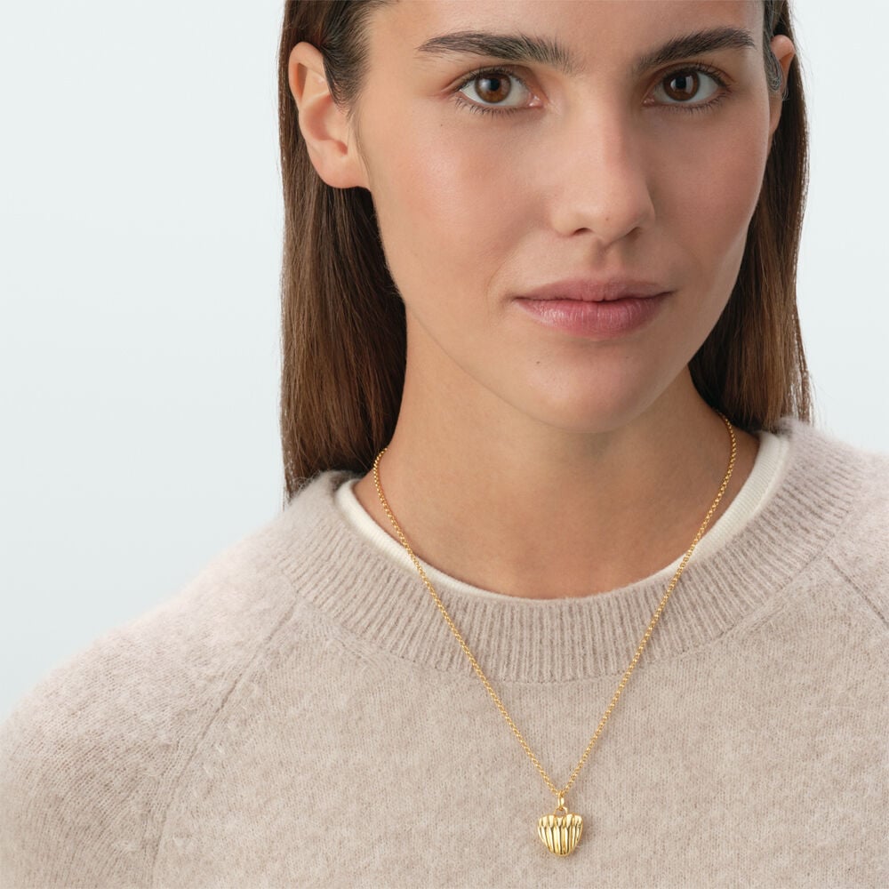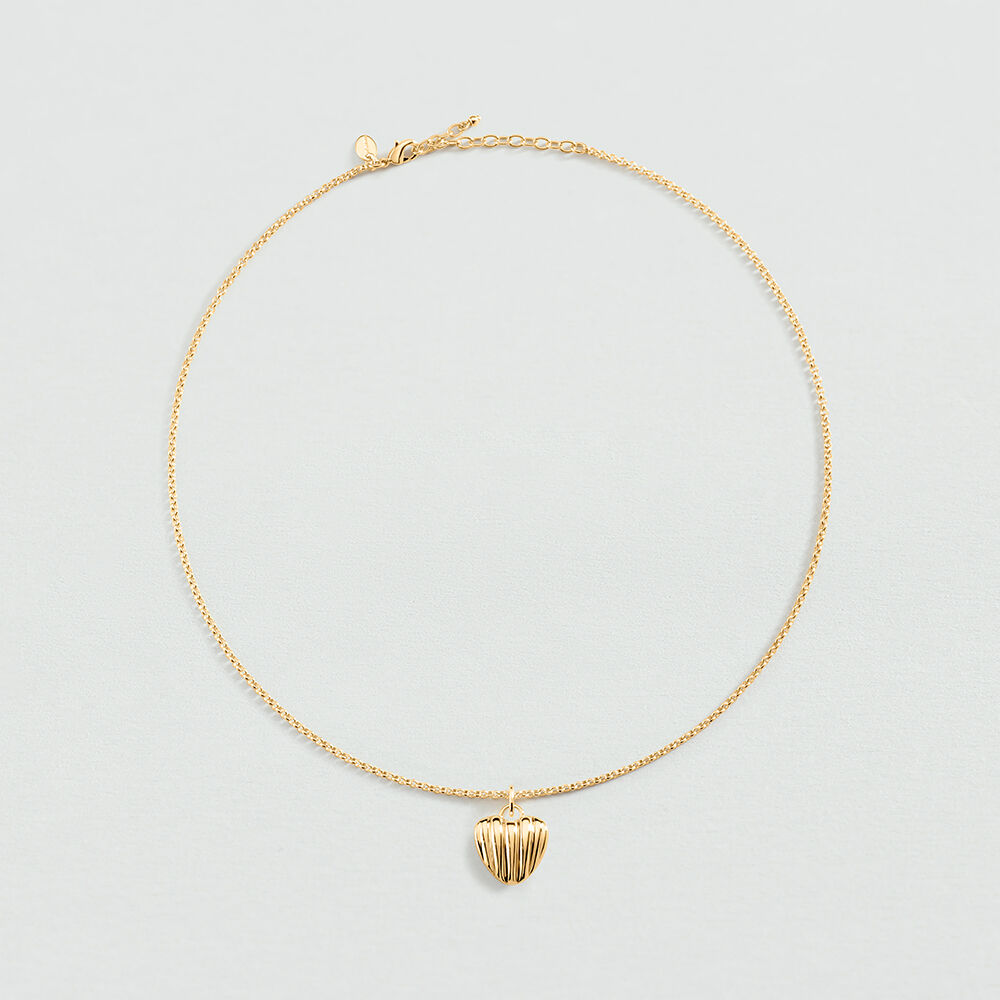 Collar corto acabado en oro y colgante en forma de corazón texturizado. Un toque romántico para tu día a día que favorece mucho y levanta cualquier outfit. ¡Los corazones están de moda! Esta joya mide 420 mm con un alargo extra de 50 mm