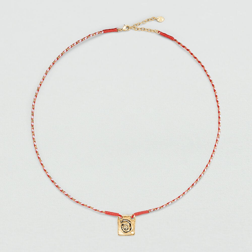 Collar corto acabado en oro con cuerda y plaquita con caracola grabada. Una joya ideal para combinar con otros de tus collares favoritos a diferentes alturas para un resultado de infarto. La flor de Tiaré es una flor tahitiana que florece a la vez que el verano: de mayo a septiembre. Disfruta de la mejor época del año en forma de joya con la nueva colección de Maria Pombo X Agatha.