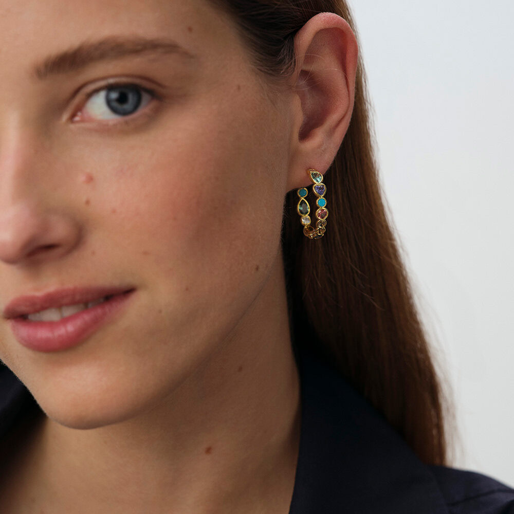 Criollas acabadas en oro con circonitas de diferentes formas. Un diseño original con el que sorprender y divertirte creando lookazos. Favorecen a más no poder y aportan un brillo muy especial a tu día a día.