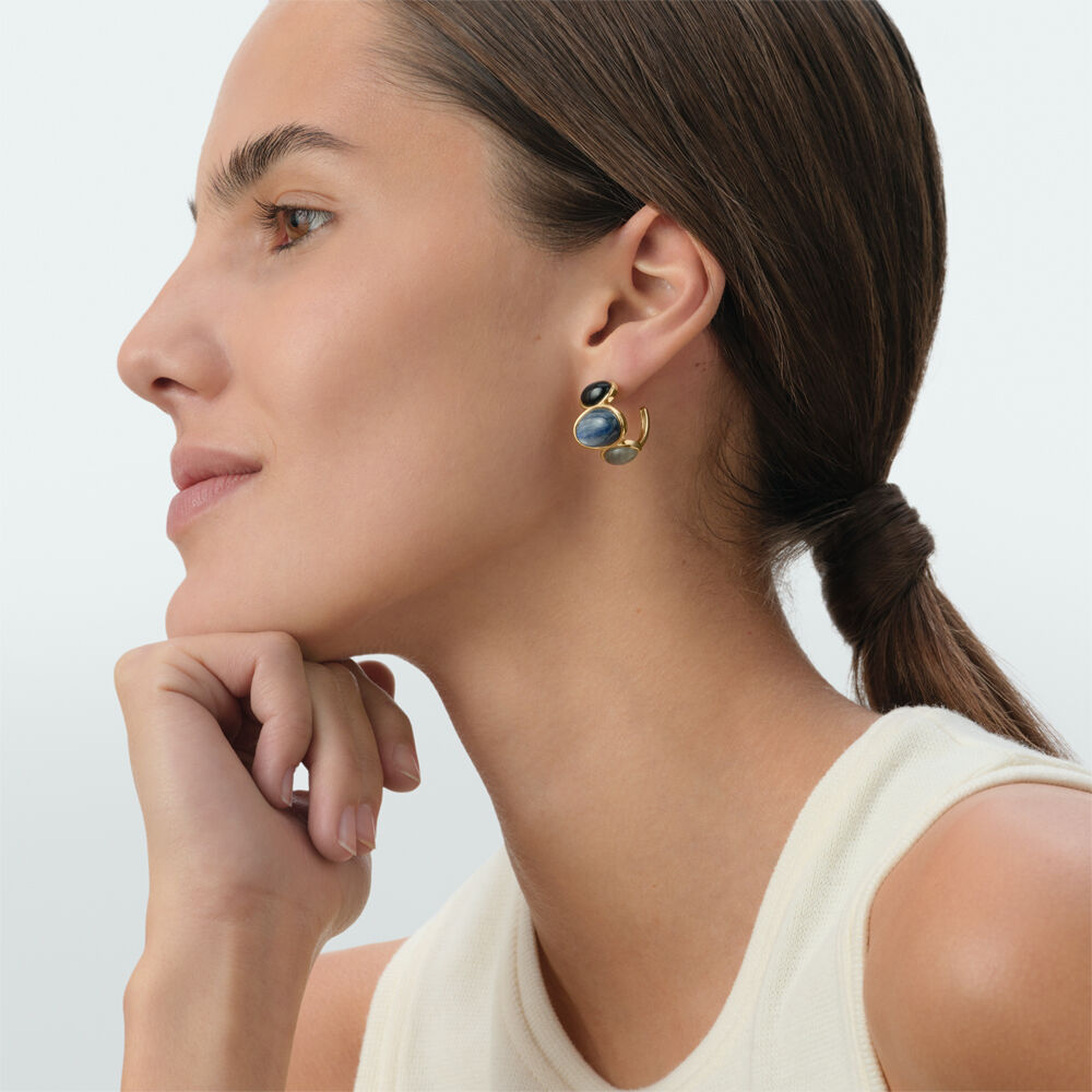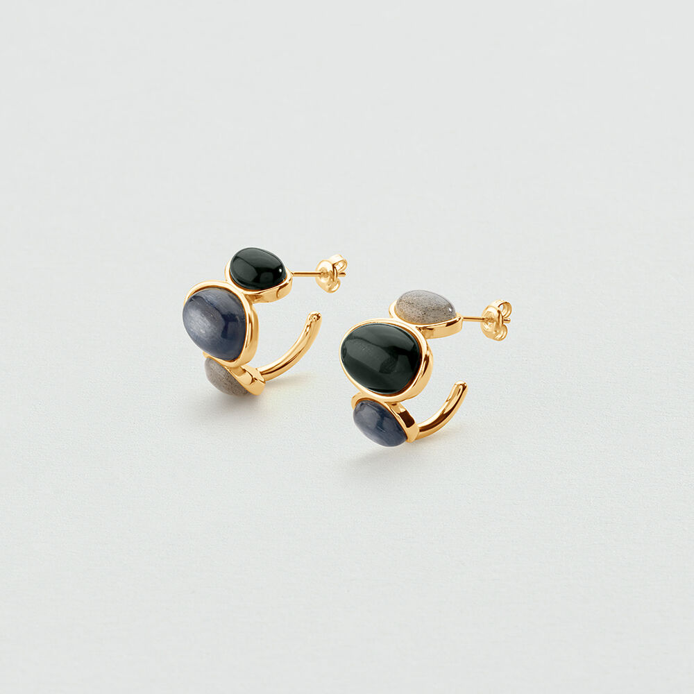 Pendientes acabados en oro con tres cabujones en tono azul. Diseñados para atraer miradas y convertir cualquier regalo en un acierto seguro. Están compuestos por tres piedras naturales: cianita, labradorita y ojo de tigre.