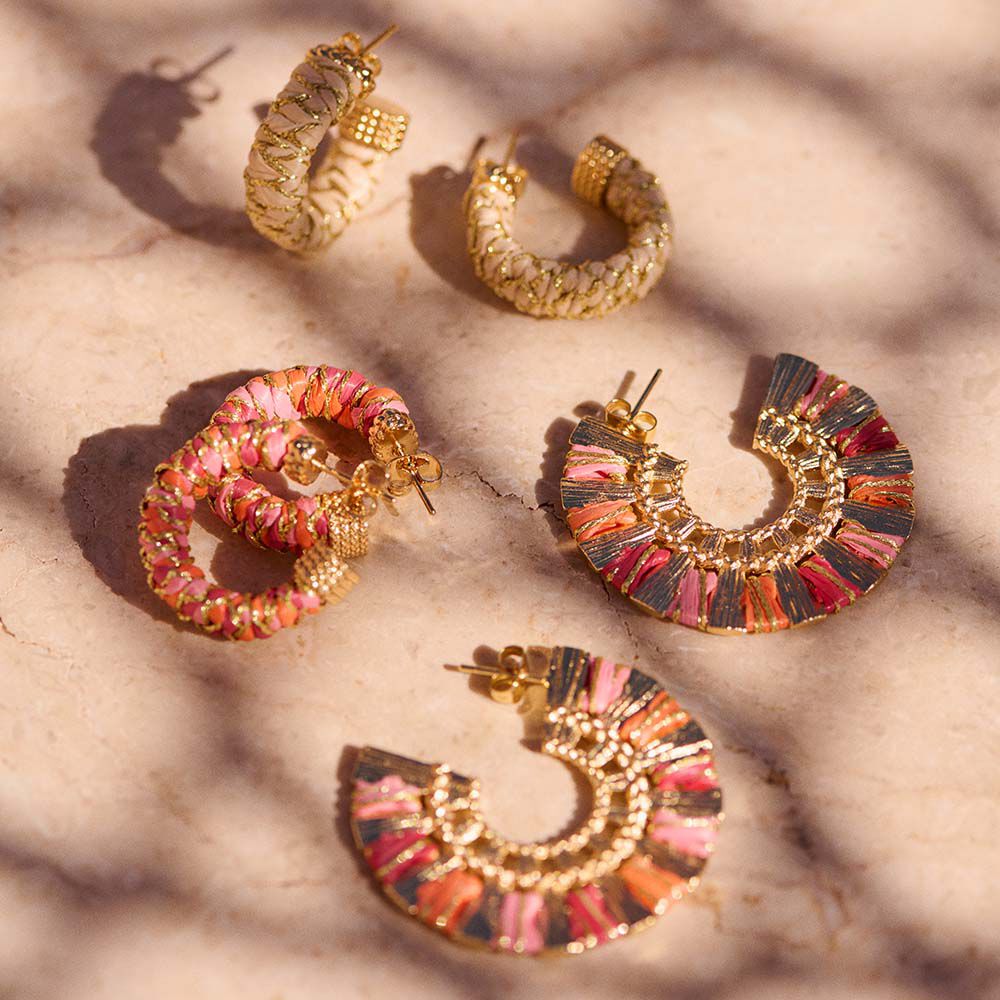 Criollas pequeñas acabadas en oro con rafia trenzada de colores. Una propuesta ideal para el verano, estilosa y que combina con todo, aportando un toque de color muy especial.